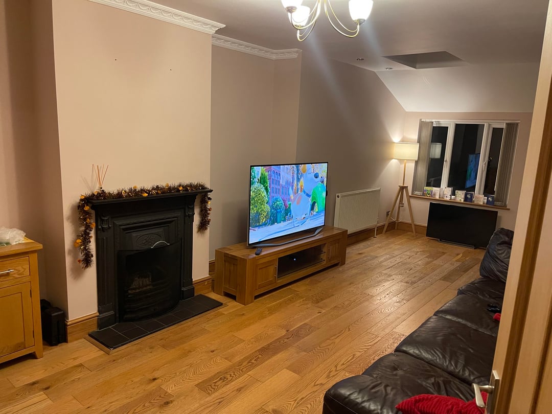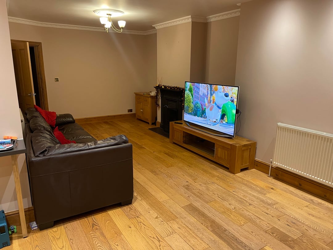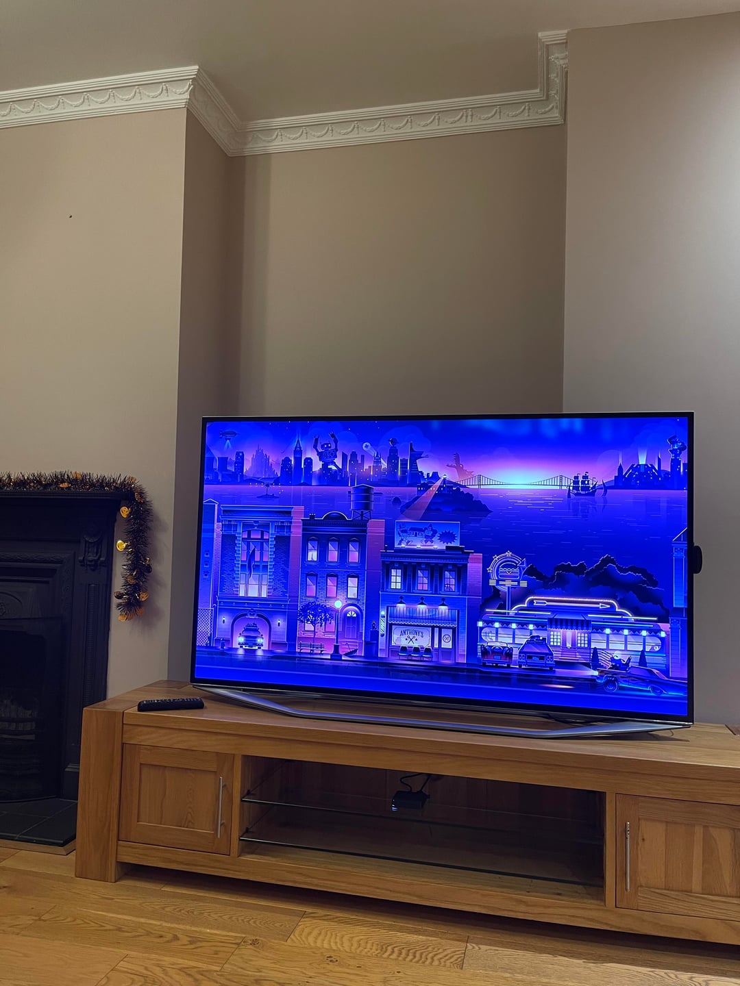 より多くの家具が備え付けられた写真は、前の所有者がどのようにセットアップしたかを示していますが、テレビはより小さく、暖炉の隣の床の間に収まっていました。現在のテレビは 60 インチですが、できればもっと大きくしたいと思っていますが、床の間に収まらないため、テレビを数フィート前に持ってきて、横からの視野角がかなり極端になってしまいます。