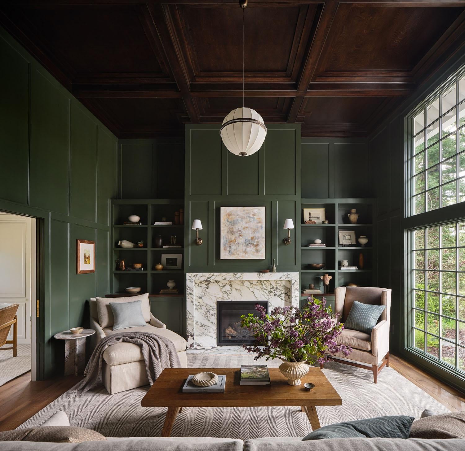 カリフォルニア州コントラコスタ郡ラファイエットにあるニューイングランド風住宅のボックスパネルモールディングのあるリビングルーム [1500×1456]
