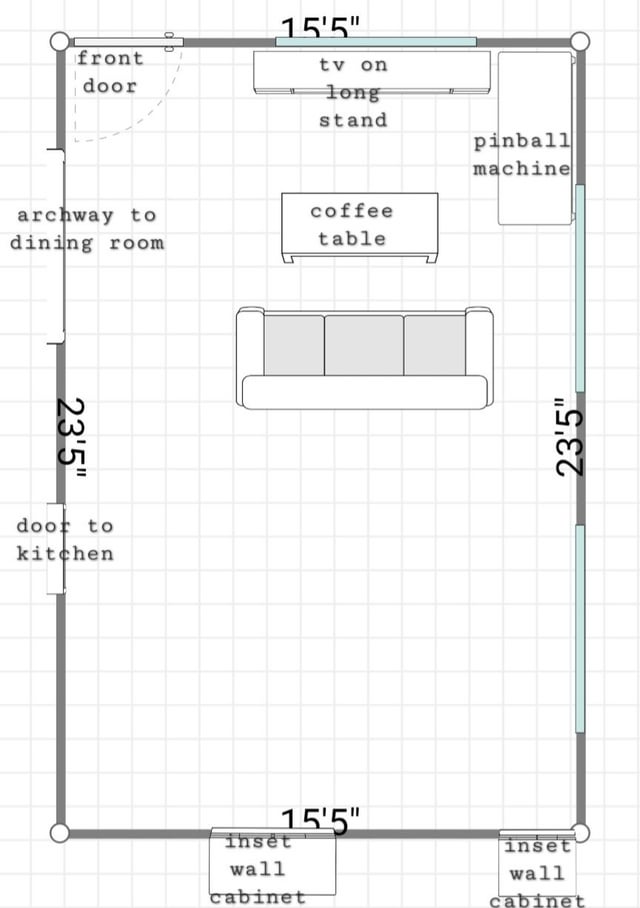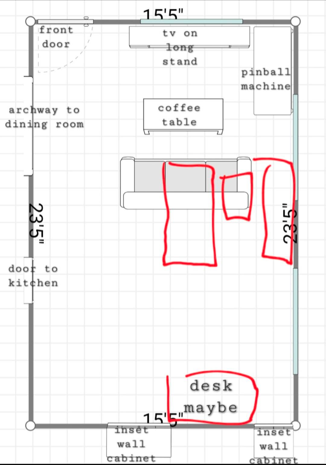 1 つ目は現在のセットアップ方法で、2 つ目は次の試みに移ります。私が探しているのは、もっとうまくいくかもしれない他のアイデアだけだと思います。古い家なので、いくつかの特殊性があり、左下隅はまったく利用できず、サーモスタットがあるため、ダイニングルームとキッチンの入り口の間には、せいぜいアクセントテーブルか本棚しかありません。ピンボールマシンはフルサイズのアンティークで、実際には部屋の他の場所に置くことはできません。これで十分な情報だと思います。ご覧いただきありがとうございます。良いアイデアを期待しています。