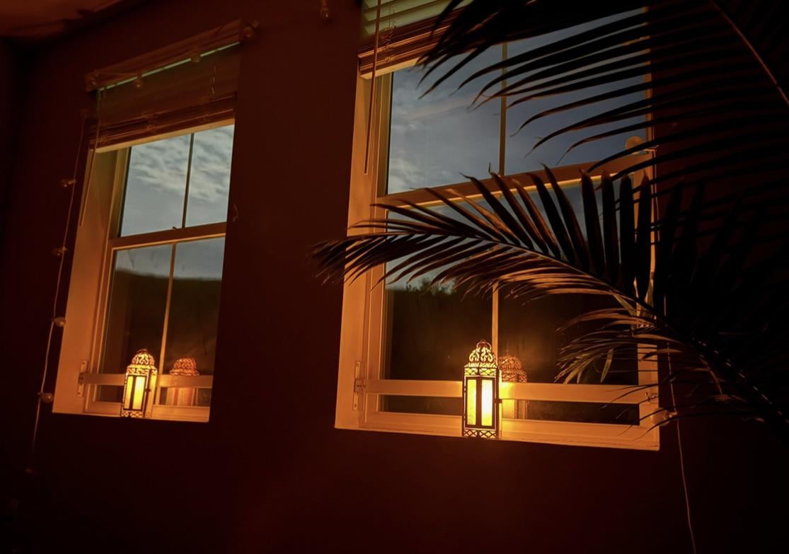 モロッコのランタンと琥珀色のLEDティーキャンドルを備えた私の居心地の良いベッドルーム
