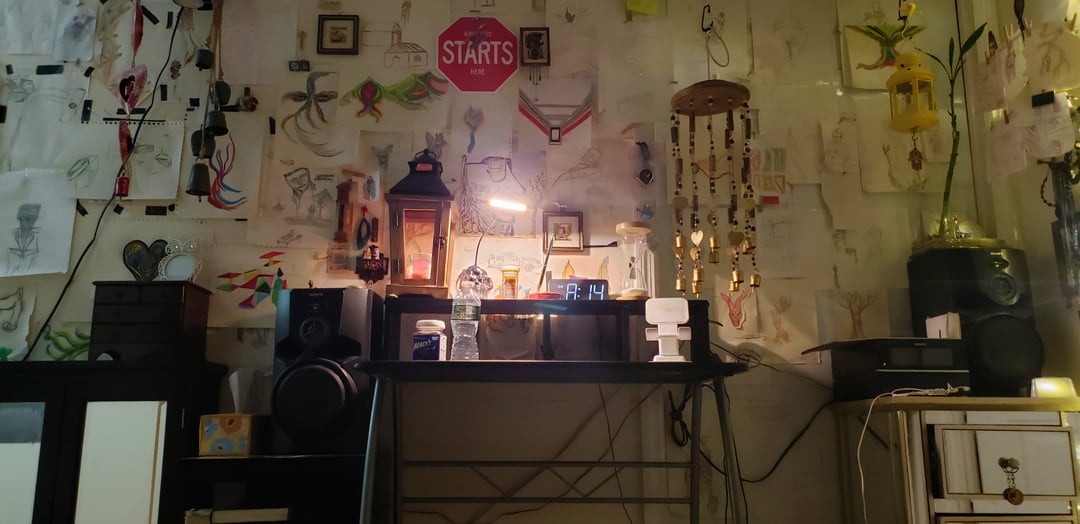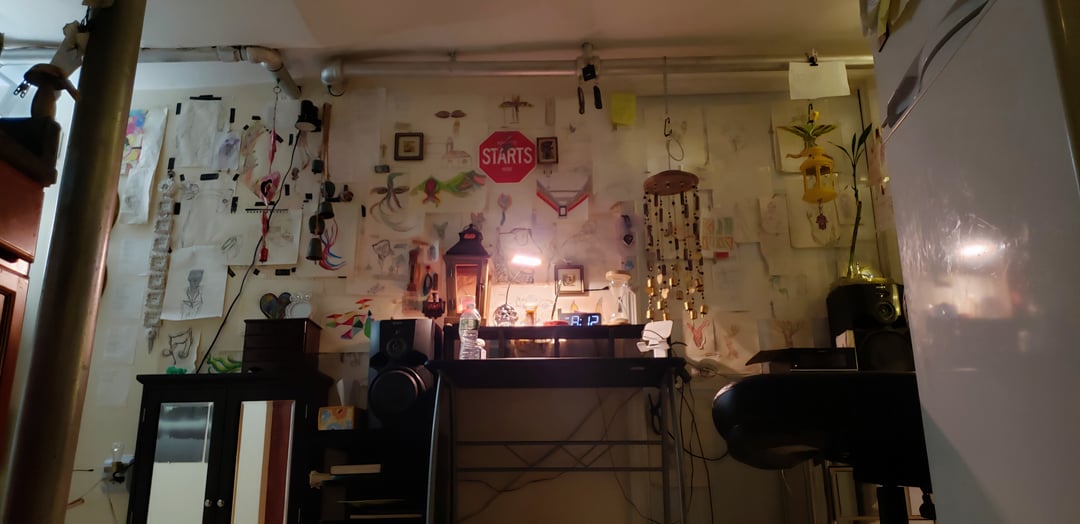 ニューヨークのアパートの地下にある居心地の良いワークデスク。 👨🎨🪔🛋
