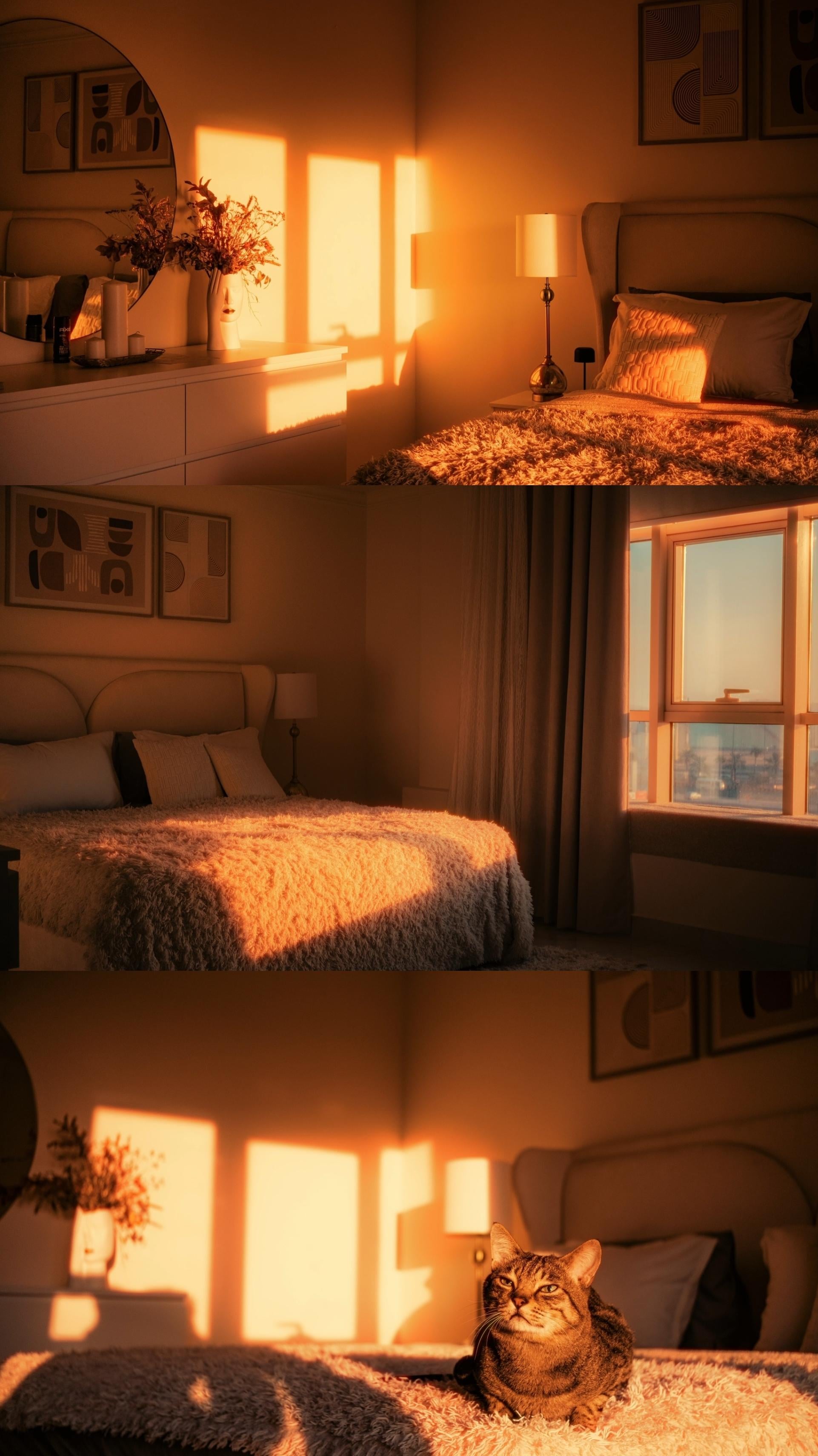 今日は午前6時の太陽の光のおかげで、私の寝室がとても快適に見えました