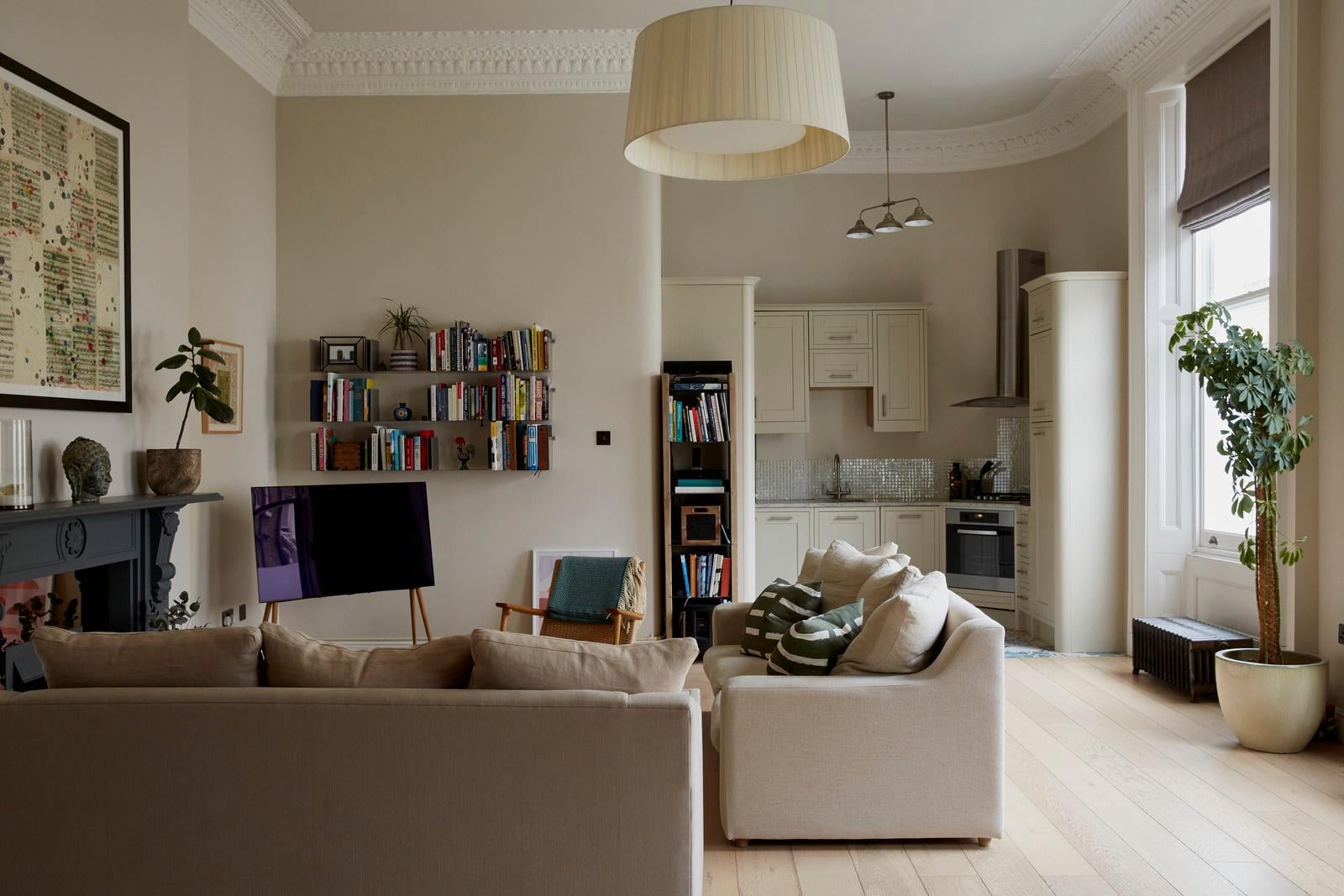 ビクトリア朝のパブを改装した 1 階にあるオリジナルの装飾が施された光に満ちた 2 ベッドルーム アパートメント、フォスコテ ミューズ、ウェストミンスター市、ロンドン、英国 [1600×1067]