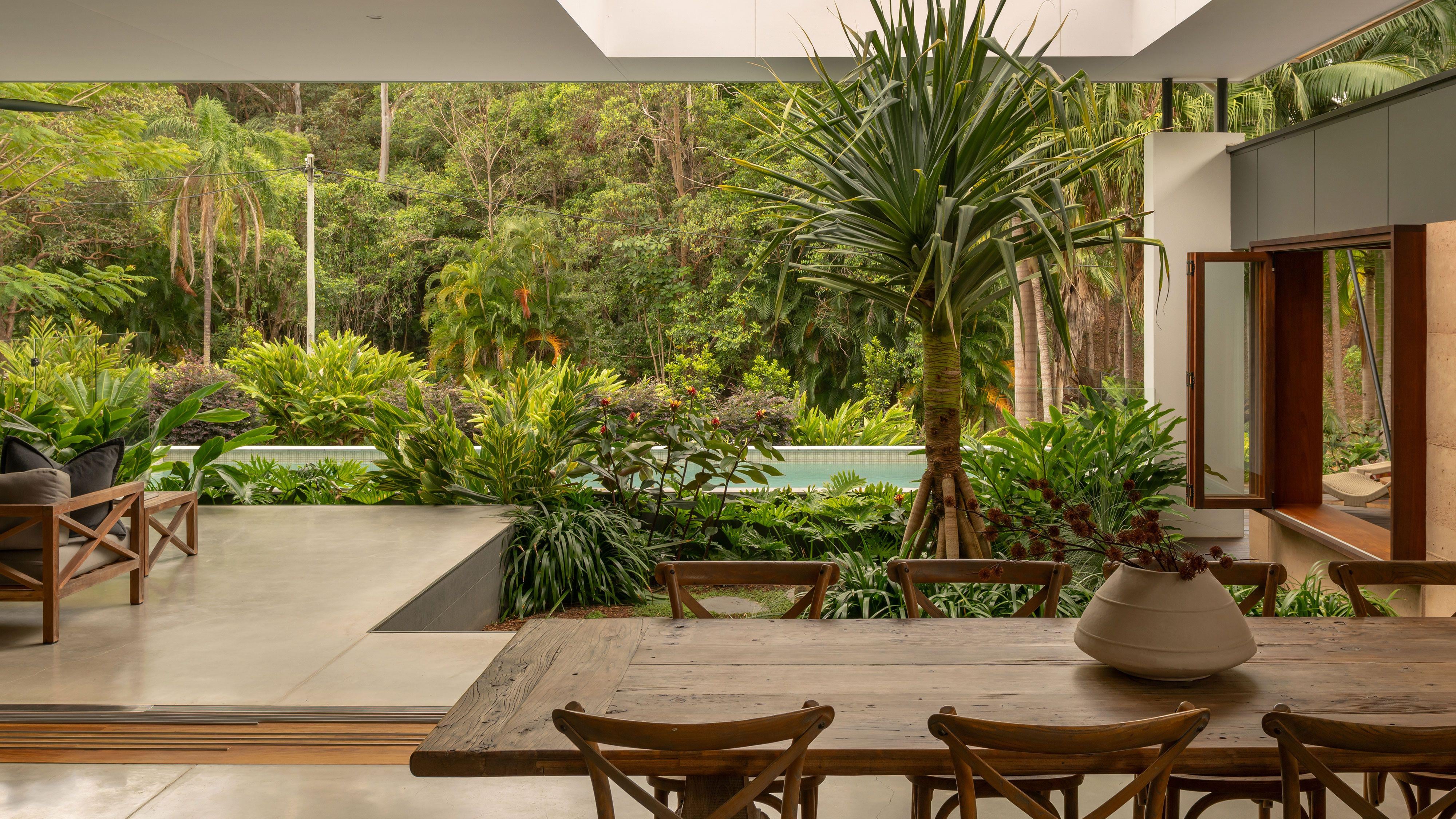 オーストラリア、クイーンズランド州ドゥナンの屋外邸宅にある、緑豊かな庭園とプールに面した壁一面のローズウッド スライダーを備えたダイニング スペース [4000×2249]