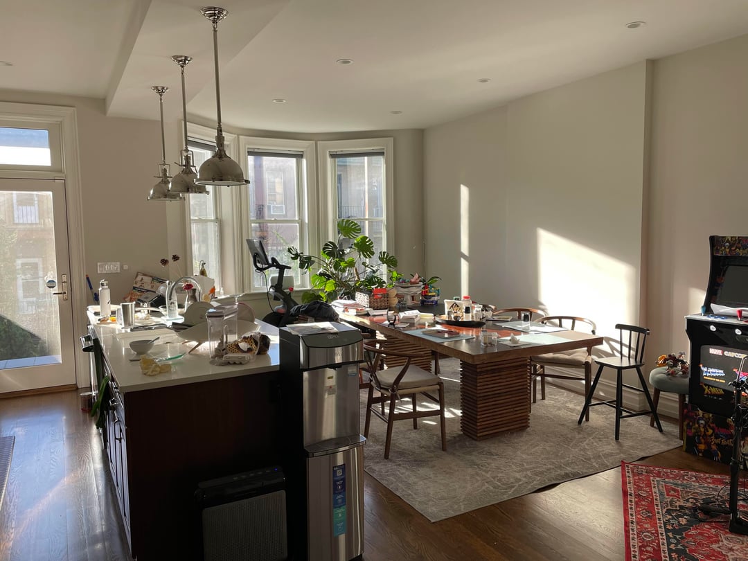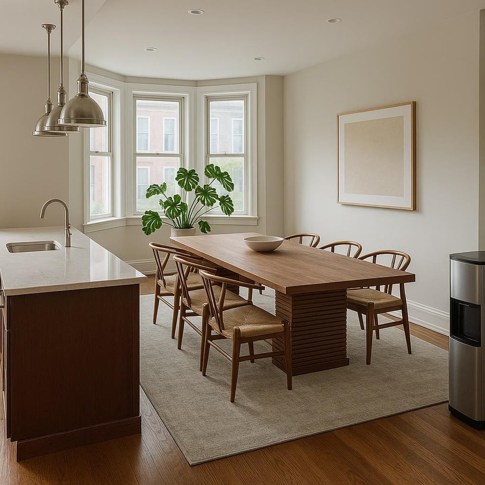 主な目標は、見た目を美しくしながら、整理整頓したり隠したりできる宿題の勉強エリアや、小さな家族のための定期的な食事も可能にすることです。現在、キッチンに大きなテーブルとたくさんの物が散らかっているので、92 を維持すべきかどうか迷っています。" ダイニングテーブルを片付けてただ片づけるか、それとも大きなテーブルを処分して3つの別々のエリアを作るべきか。1. 出窓に楕円形または円形のテーブルを置いた朝食コーナー、2. 反対側の隅に宿題コーナー、3. 座ったりくつろいだり、アイランドスツールを置くための中央エリアを開けたりする。