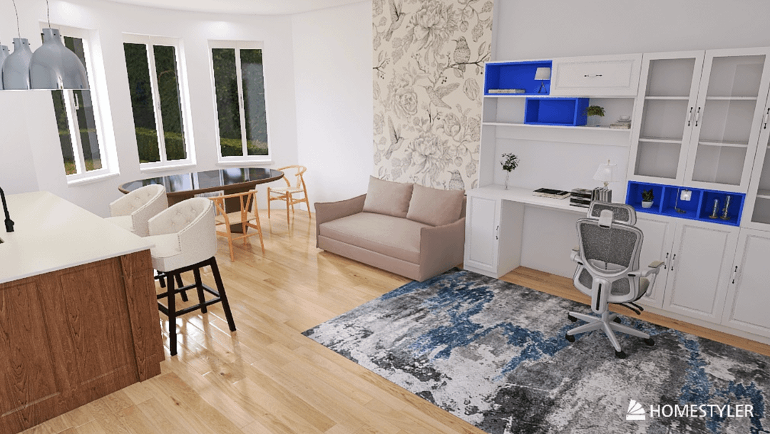 ここにいくつかのモックアップがあります。3D レンダリングにはいくつかの家具をドラッグ アンド ドロップする必要があり、サイズと配置を探しているだけだったので、今のところ最後の写真の家具のスタイルと色は無視してください (たとえば、オフィスの椅子や青い箱を用意するつもりはありません)。人々がレイアウトについてどう思うか知りたいだけです。