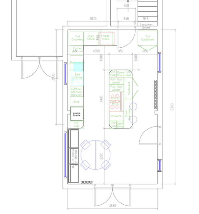 主な懸念は、島が流れにどのような影響を与えるか、そして十分な貯蔵庫(食器洗い機、調理器、オーブン、冷蔵庫、洗濯機はすべて必要)があるかどうかです。