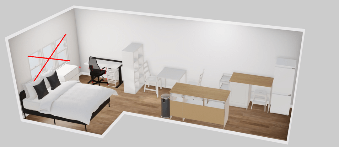 – まず、間取り図では当初窓は北側の壁にあると書かれていましたが、実際には東側の壁にあり、非常に不便な場所で壁の表面積の大部分を占めています。これ自体は最悪のことではありませんが、そこに置く予定だった家具のほとんどが壁に接続されずに自立し、自然光が遮られることを意味します。
