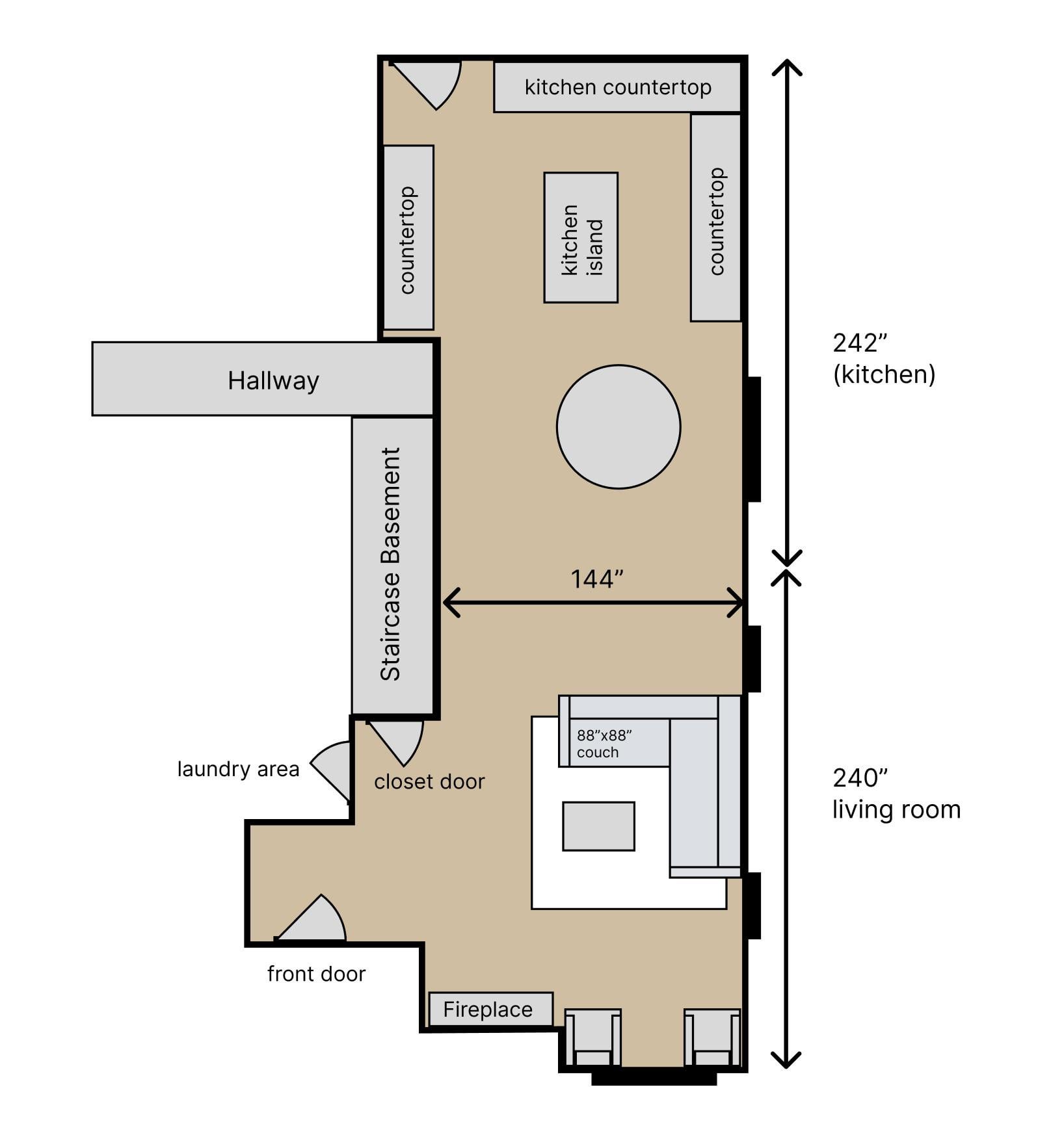 私が理解できない最大のことは、これが良いレイアウトであるかどうかです。暖炉の上にテレビを吊るす予定です(電気式のポータブルマントルピースです)。このレイアウトに家具を移動しましたが、玄関ドアに露出しすぎているように感じます。それが私の感覚なのか、それともレイアウト設計が悪いのかはわかりません。