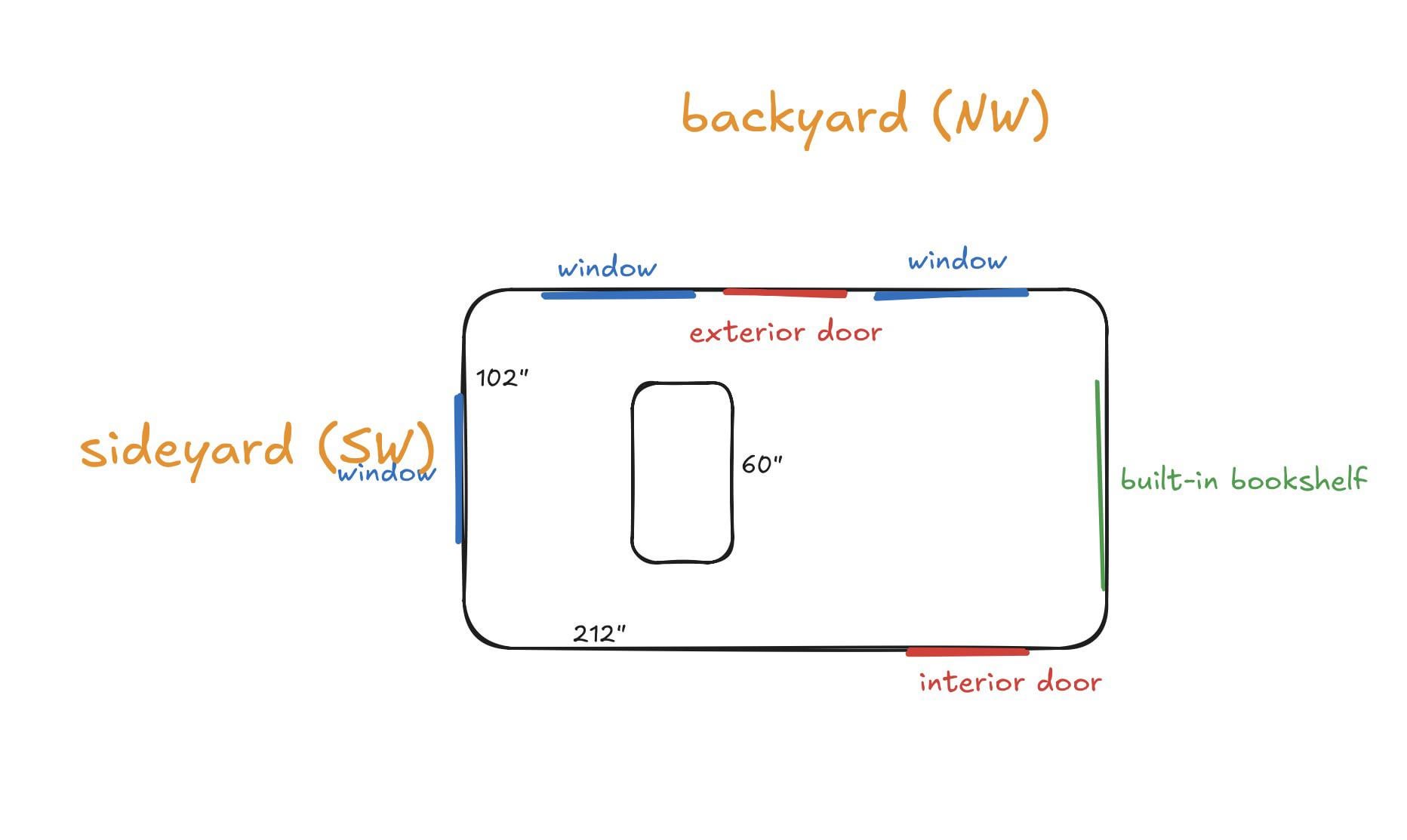 他の解決策として考えられるもの – 幅48インチの小さめの机を買う – 室内ドア付きで机を壁に寄せる(部屋の対称性が薄れる) – 机を裏庭に向ける(ドアが後ろにあると不快に感じる(部屋の真ん中に仕切りの棚を用意しない限り)