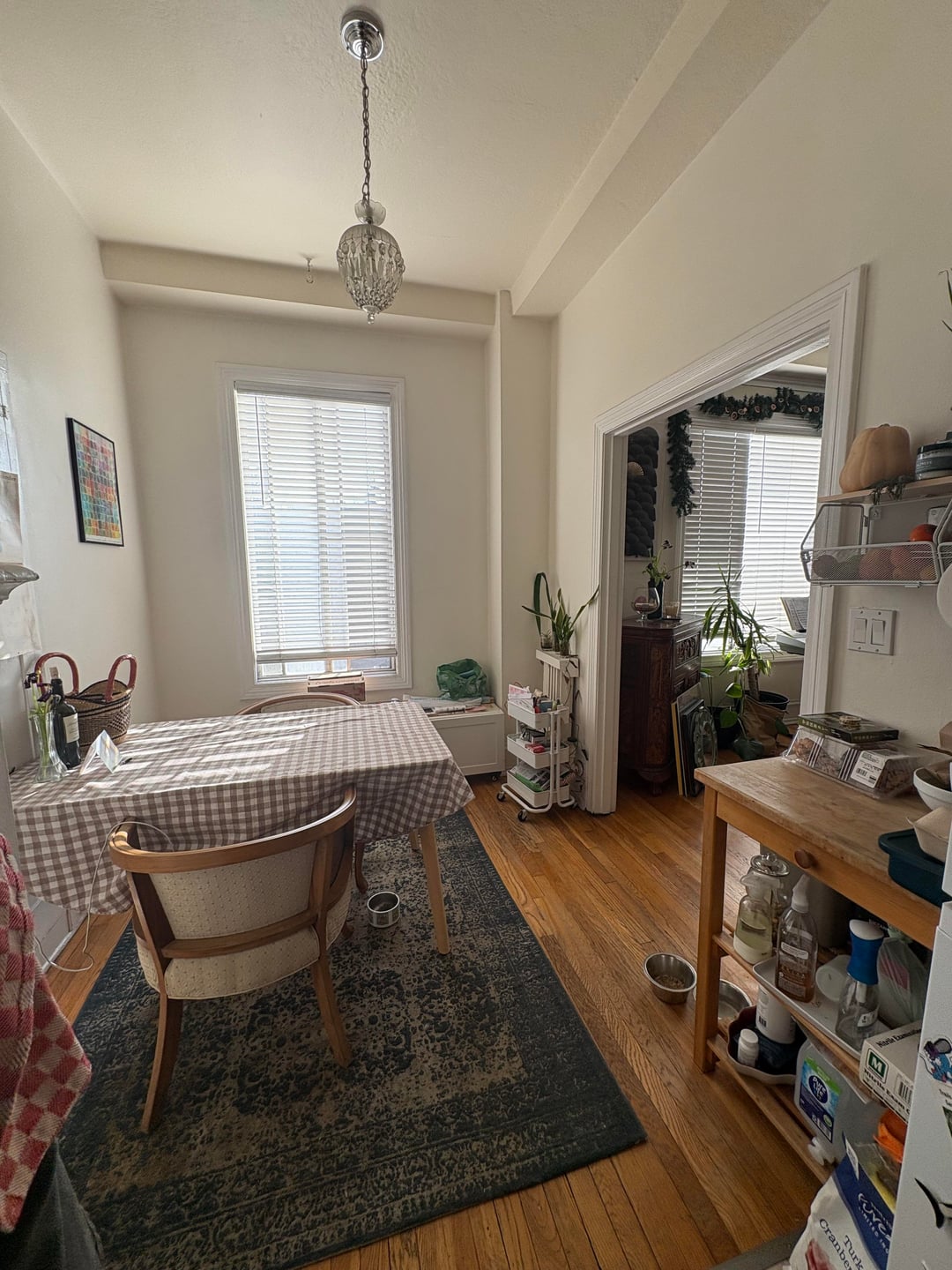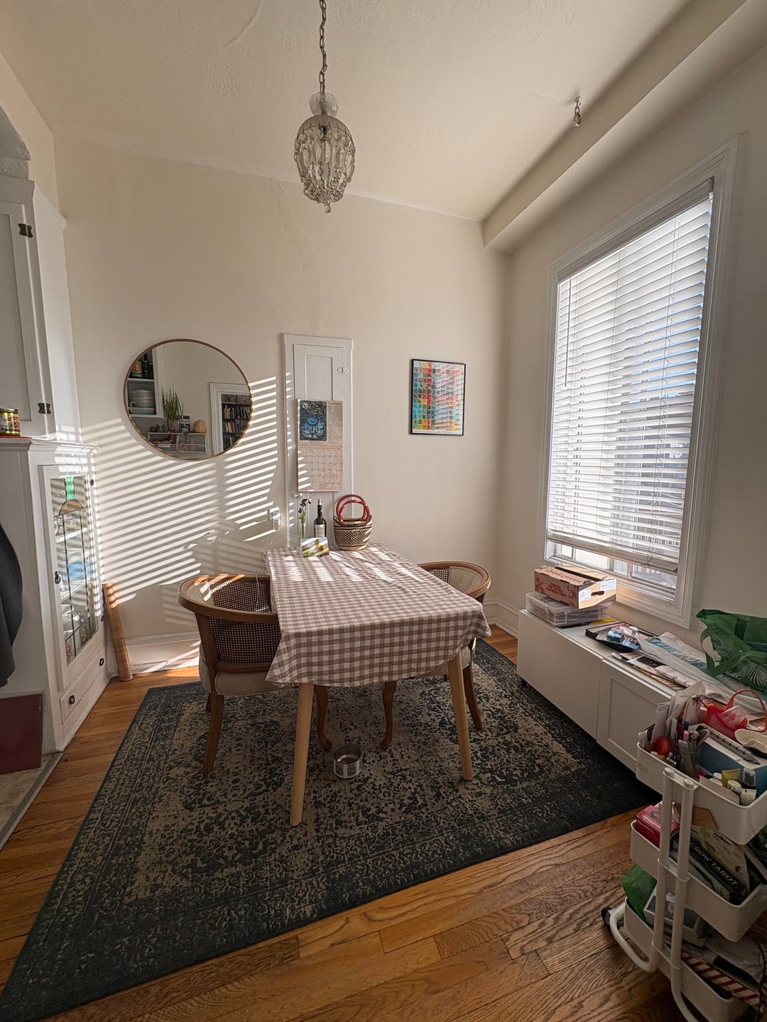 より効率的にスペースを設定する方法についてのアドバイスを求めています。それとも、私は何が足りないのか、何が必要なのかを完全に見逃しているのでしょうか?窓の下にある棚ユニットとユーティリティカートは無視してください。ベンチとしてのサイズをテストした結果です。非常に小さなスペースなので、テーブルのサイズを犠牲にせずにスペース効率を高めたいと考えています。ベンチの隅を検討しましたが、壁の真ん中のコンパートメントの後ろにある未使用のアイロン台をどうすればよいかわかりません。窓も低い位置にあるので、そこに寄りかかるのは危険です。