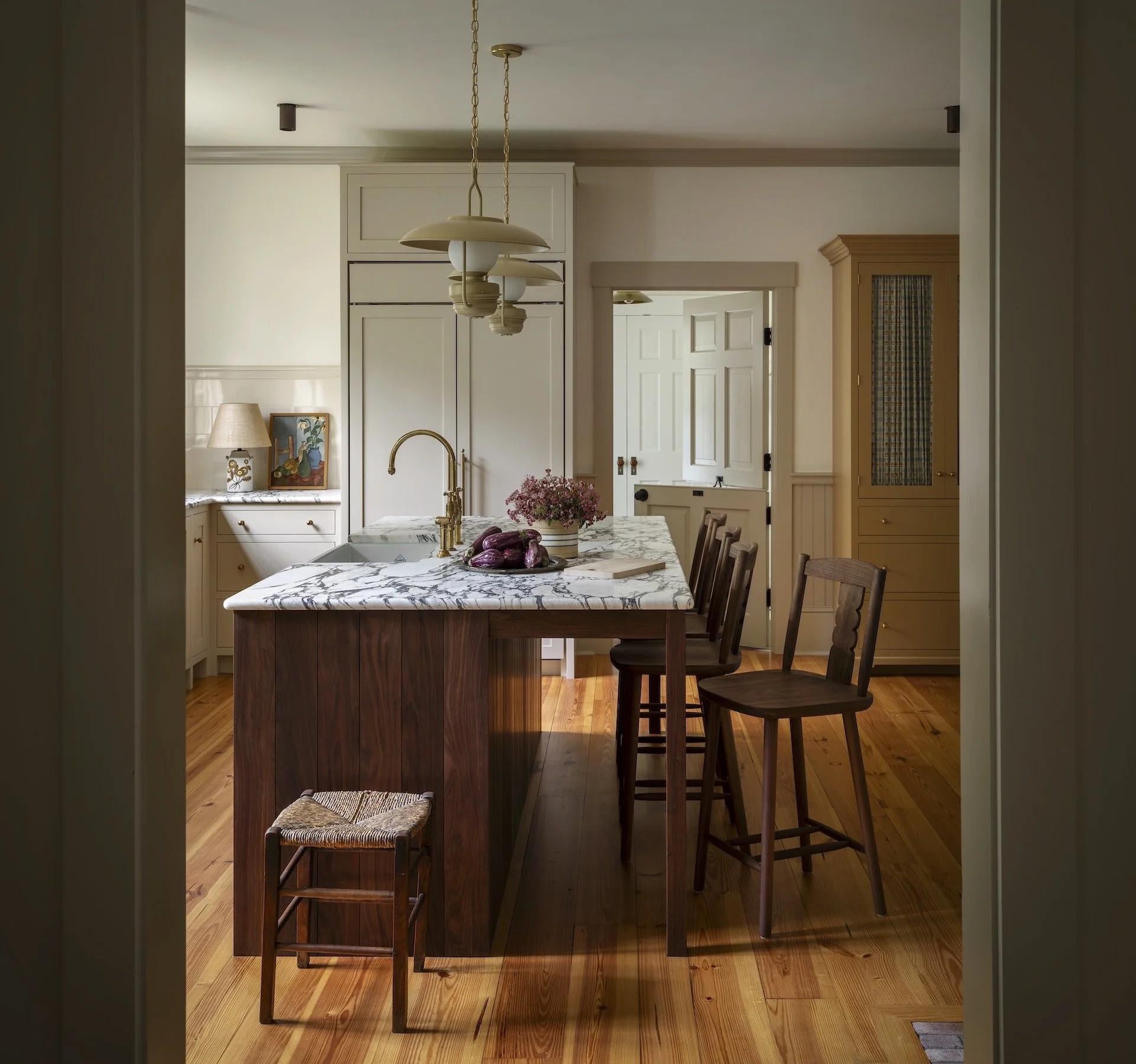 メイン州サガダホック郡、改装されたジョージタウン邸宅にある大理石のトップアイランドのあるキッチン [1920×1798]