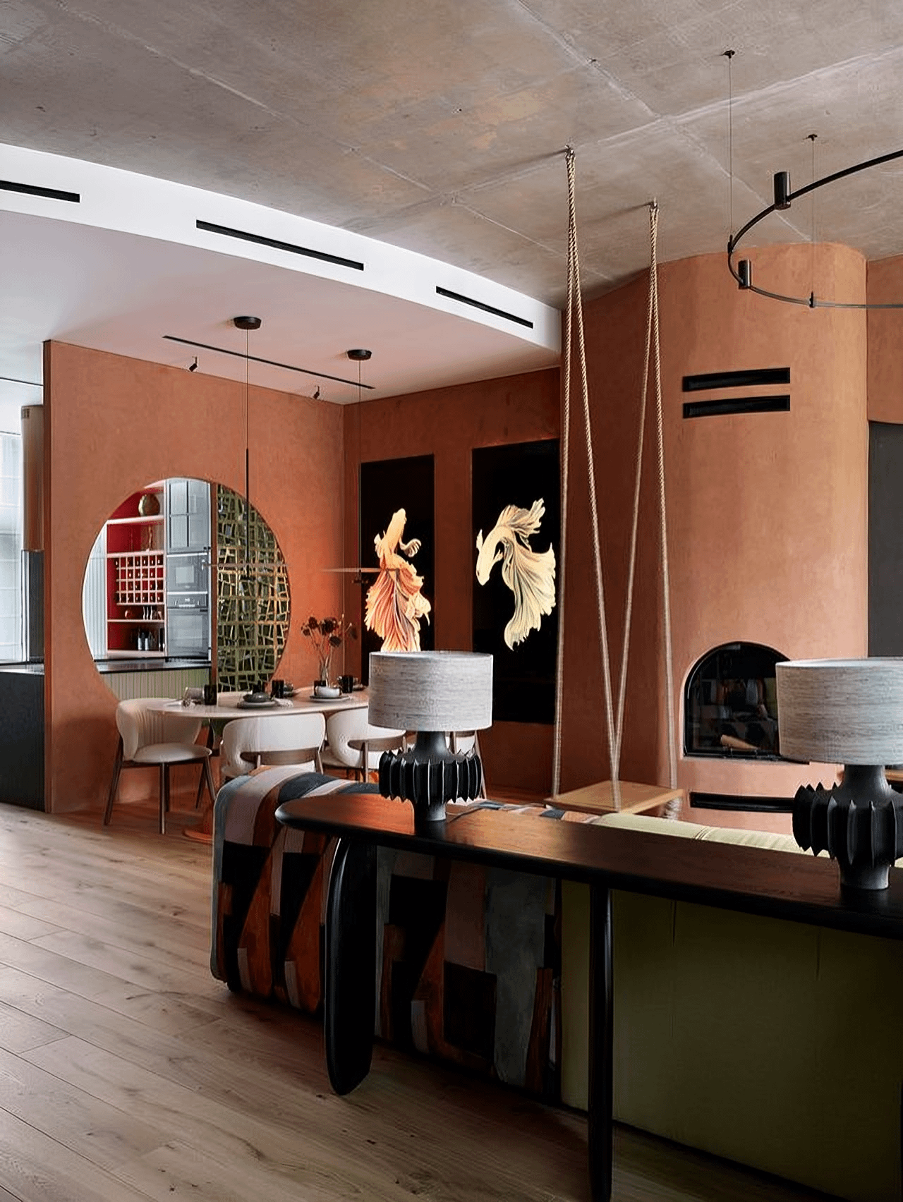 テクスチャーのあるテラコッタの壁と屋内ブランコのあるリビング ルーム、バルセロナ、スペイン [1200×1704]