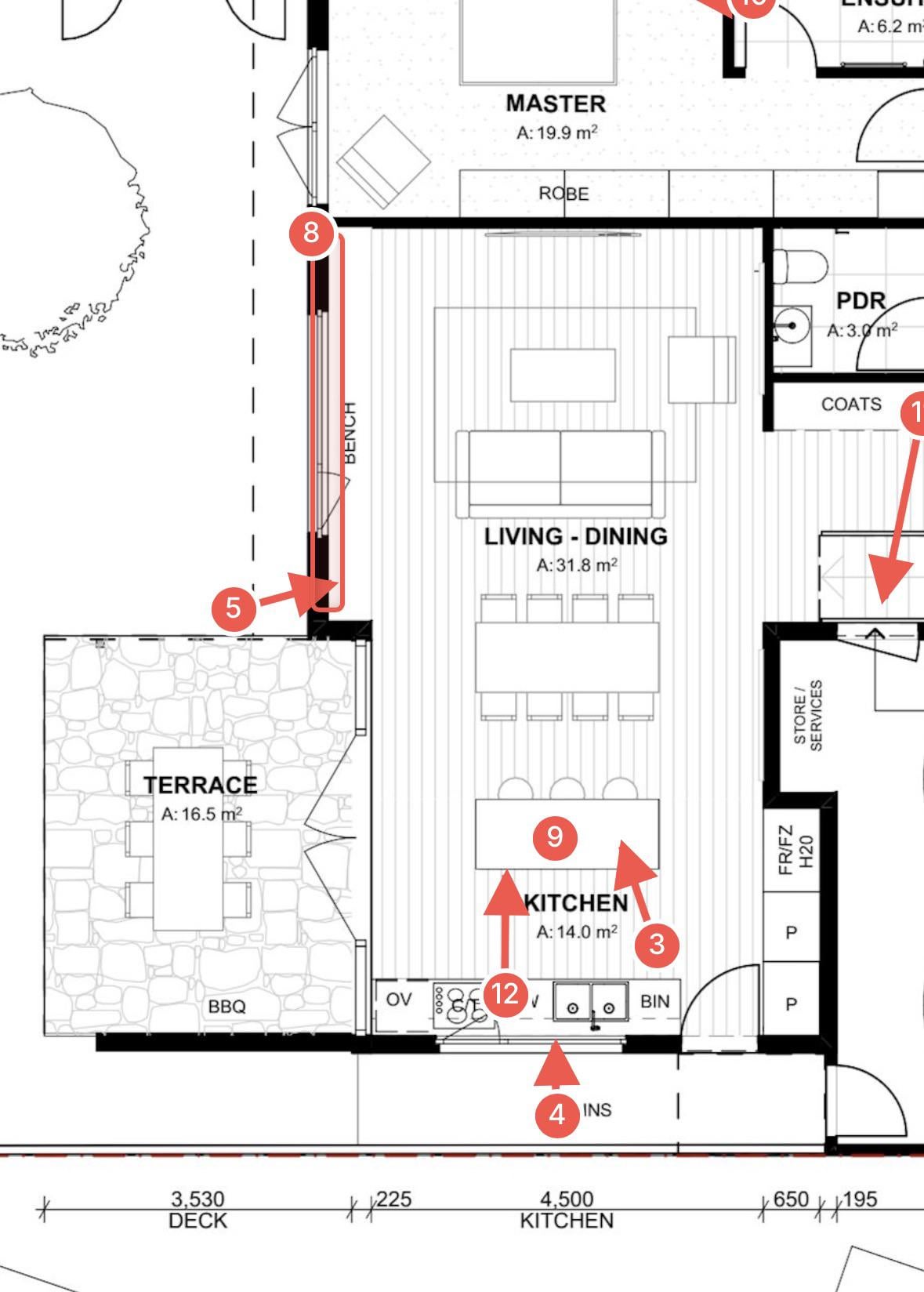 皆さん、こんにちは。新築を計画している設計段階で、キッチンエリアについての人々の意見を知りたいと思っています。 建築家は、スペースをきれいに保つために島に調理台やシンクを置かないようにすることを提案していますが、ベンチにはあまりスペースが残らないので、特に左端にはエスプレッソマシンとグラインダーを置く予定です。 これについてみんなはどう思いますか?島に沈む?私はコンロがそこにあることにはかなり反対ですが、それについては考えを変えることができるかもしれません