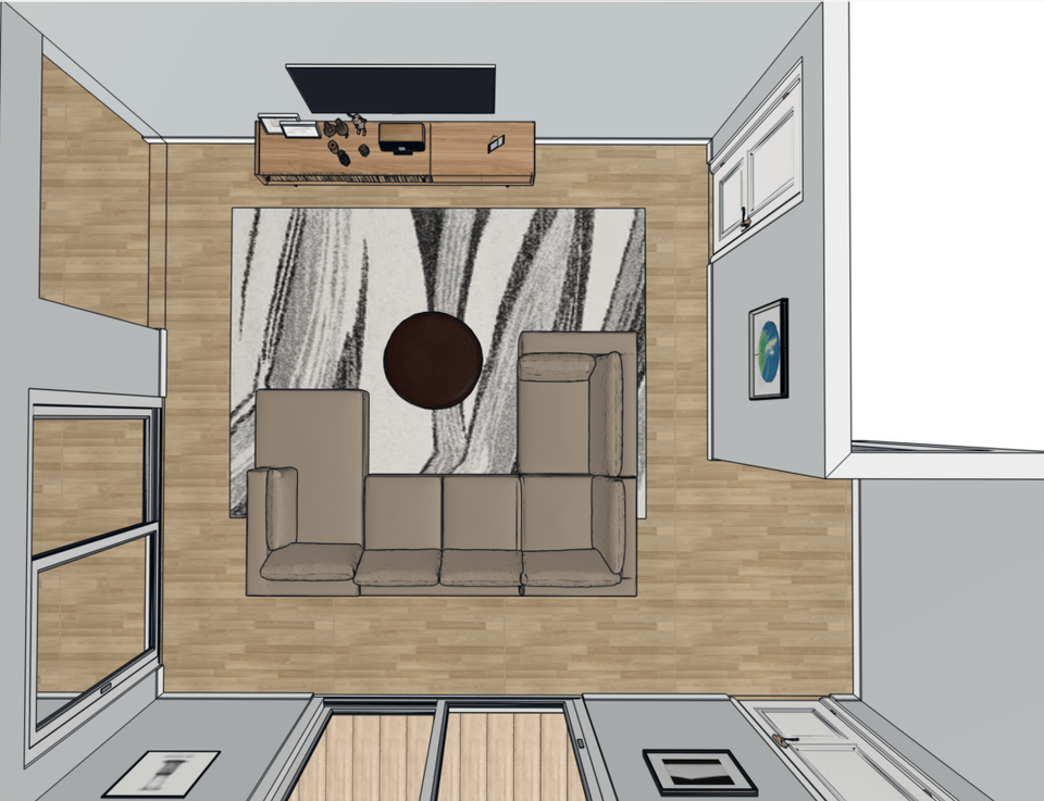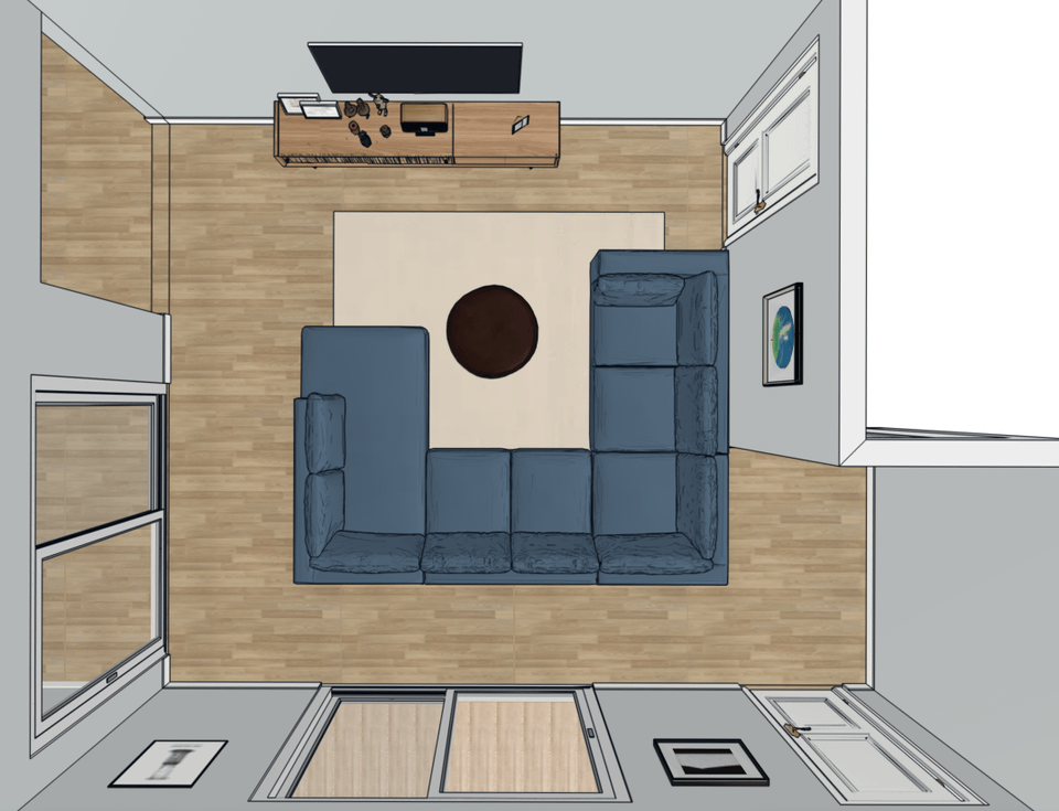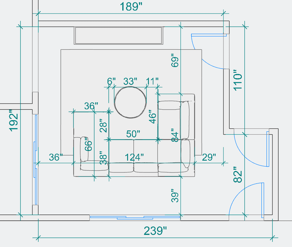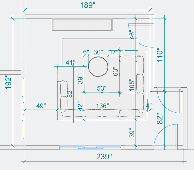 家のこの部分のレイアウトのせいで、座席を最大限に確保する方法に私たちは非常に混乱しました。我が家のテレビ部屋として使っています。 189インチの壁にはテレビがあり、後ろの壁には大きな窓があり、左下にはスライド式のガラスドアがあります。左上はキッチンに通じており、右上はガレージにつながるガレージへのドアです。右奥の隅には、奥の壁から内側に向​​かって開くドアがあり、オフィスとして使用されている別の部屋に通じています。その向かい側に描かれたドアは存在しないので、無視してください。