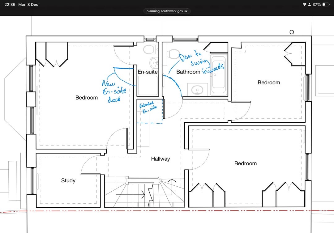 隣の家も同様のことをしましたが、専用バスルームを廊下の全長に延長しました(つまり、延長した壁が寝室の壁と平行に走り、専用バスルームと寝室が同じ長さになるようにしました。それは理にかなっていますが、廊下が少し狭く感じられ、専用バスルームも(私の見解では)必要以上に長かったように感じました。