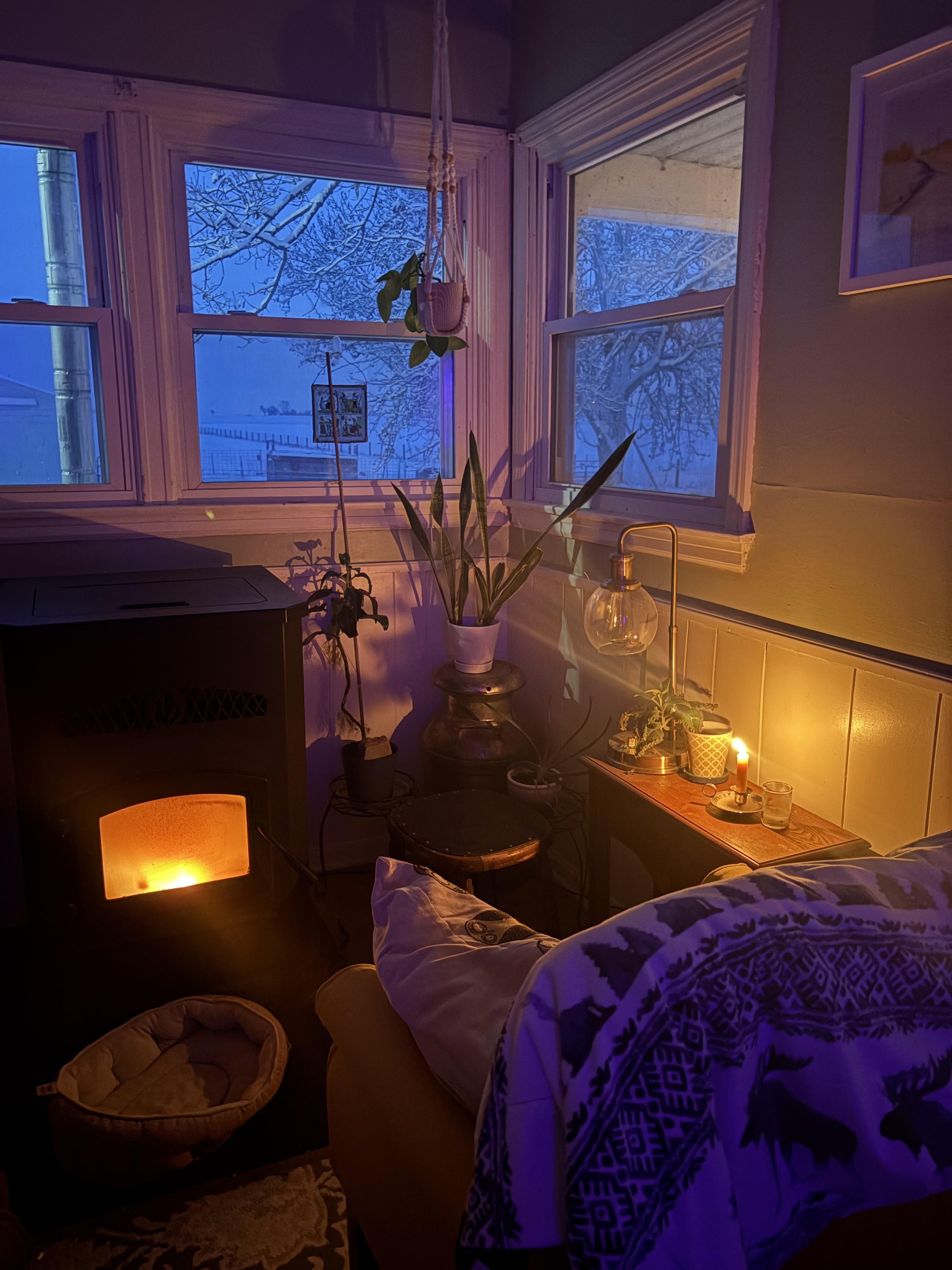 外に雪が降る日の出前の古い農家の居心地の良いコーナー。