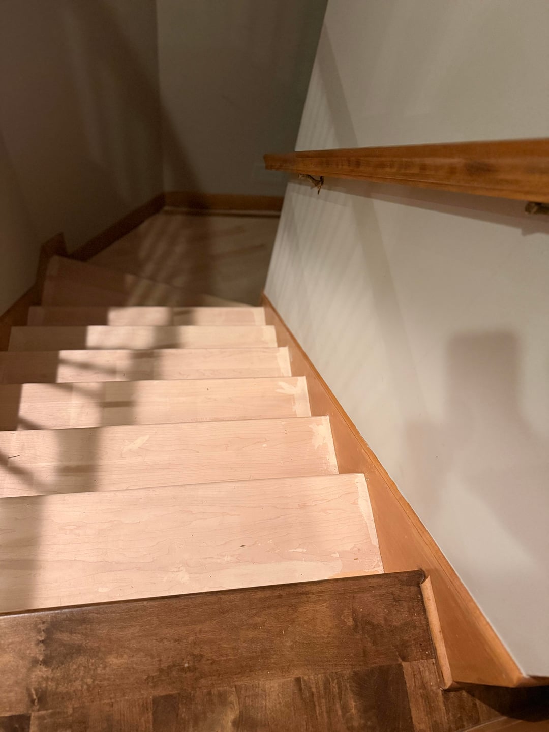 私たちの家には、オリジナルのメープルの床が随所にあります。階段の写真では、次のことがわかります。 – 設置されているが、まだ研磨も染色もされていない新しいメープルの床 – 現在の非常に暗い床 – 家全体を貫く染色された茶色のトリム