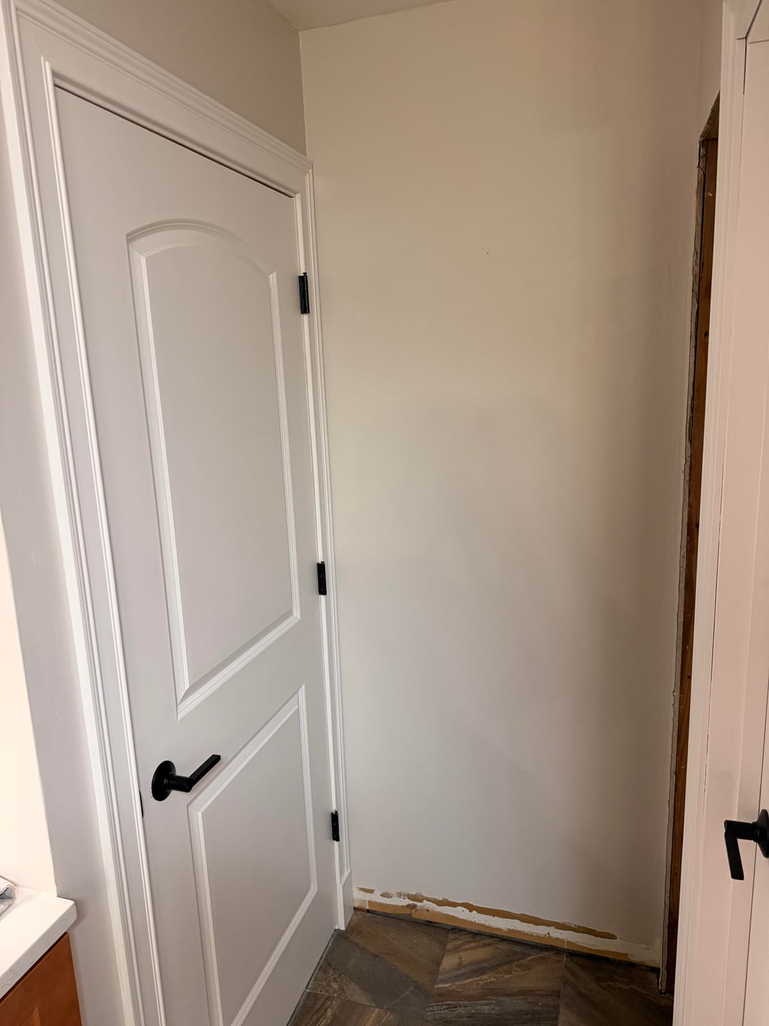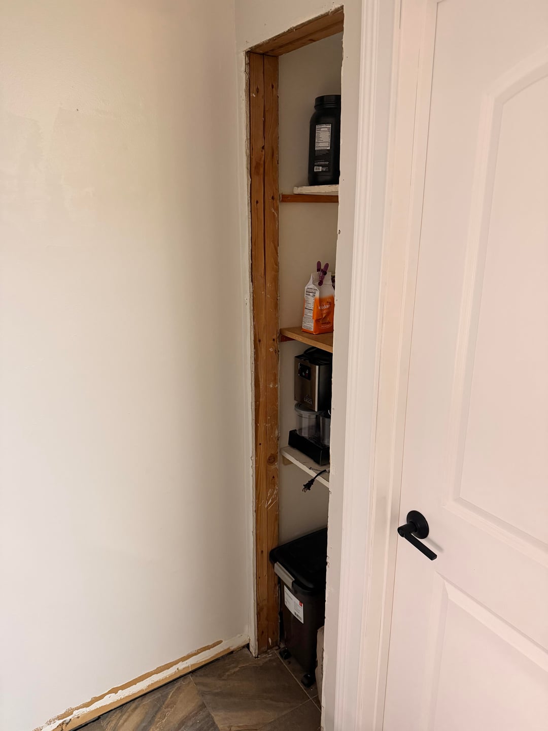 キッチンのすぐそばにあるこの小さなパントリーに関するアイデアを探しています。このスペースの幅がわずか16インチなので、一致するスタイルのドアが見つかりません。これをどのように仕上げるかについてのアイデアを探しています。私の考えは、何らかの木製/すりガラスのパントリースタイルのドアを入手するか、ドアフレームをすべて取り外して、キッチンに似たカウンターとオープン棚を備えたキャビネットを下部に追加することでした。私の唯一の懸念は、キッチンにあるパントリーの種類を基本的に排除することです。考えはありますか?