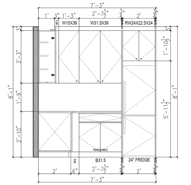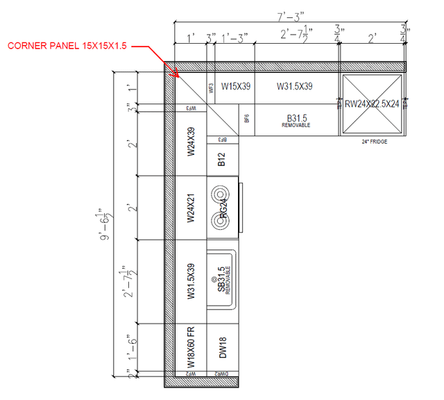 ここの誰かがキッチンプランのコールアウトを理解するのを手伝ってくれることを願っています。注記には「コーナーパネル 15 x 15 x 1.5」と記載されています。