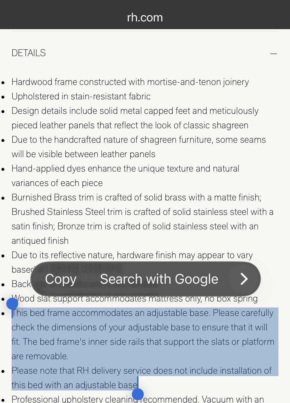 愚かな質問 – 明日配送するために RH に Graydon ベッドを注文しました。我が家にはSleepnumberのベッドがあり、サイトには調節可能なベッドに合うと書いてあります。私の質問は最後の点についてです。これは正確には何を意味しますか?私たちのベッドの周りにベッドフレームを設置してくれませんか?邪魔にならない場所に移動する必要がありますか?それとも何か別の意味があるのでしょうか?私たちのスリープナンバーベッドは、移動が簡単ではありません。同じ状況になったことのある人はいますか?前もって感謝します!