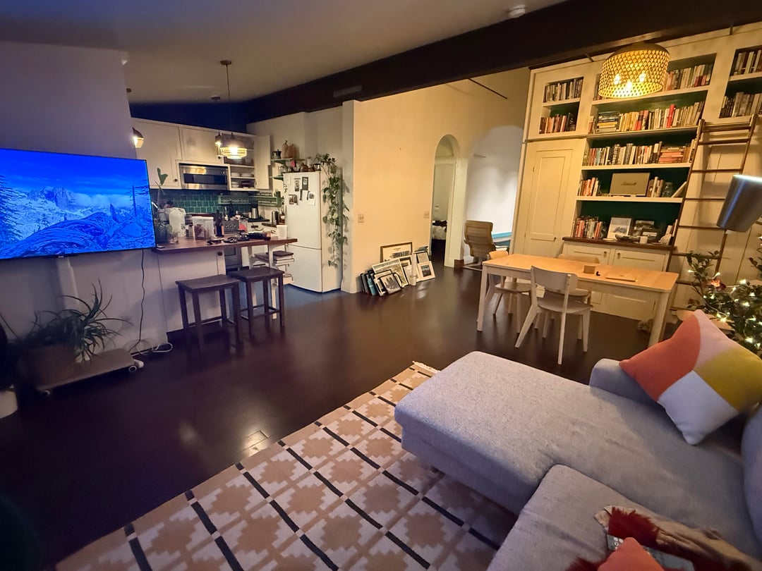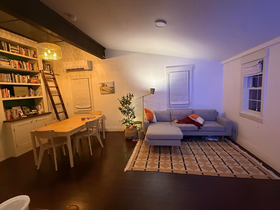 現在のアイデアは、造り付けの本棚とソファを反対側の壁に備え付けてダイニングテーブルにすることですが、ソファエリアをどのように配置するかを考え中です