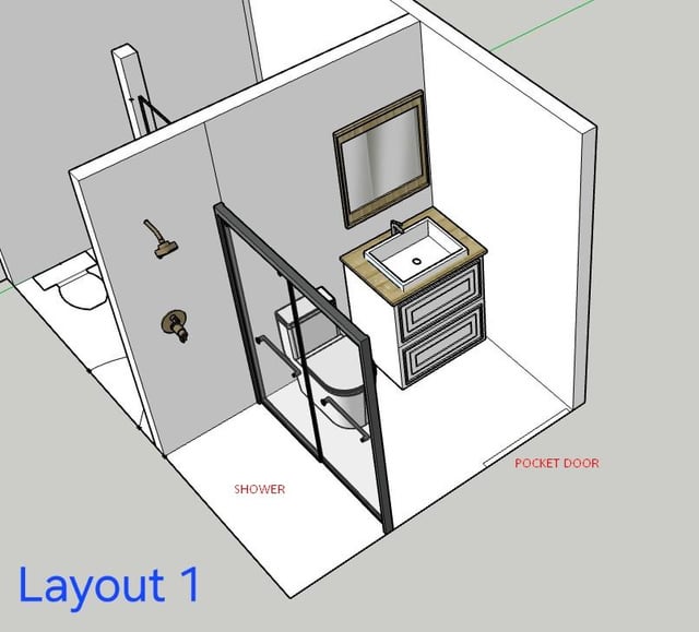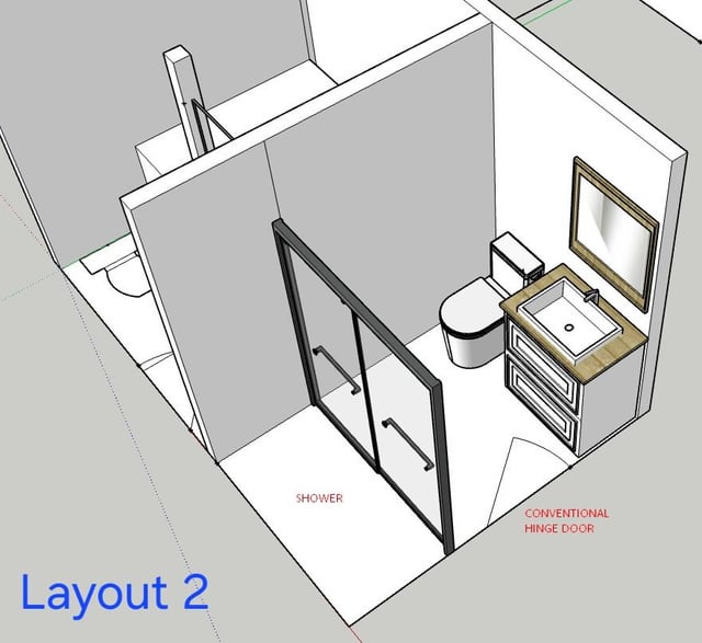 広い専用バスルームを2つに分割します。廊下からアクセスするバスルームはどのレイアウトが合理的か迷っています。レイアウト 1 と従来のドアのオプションも可能です。