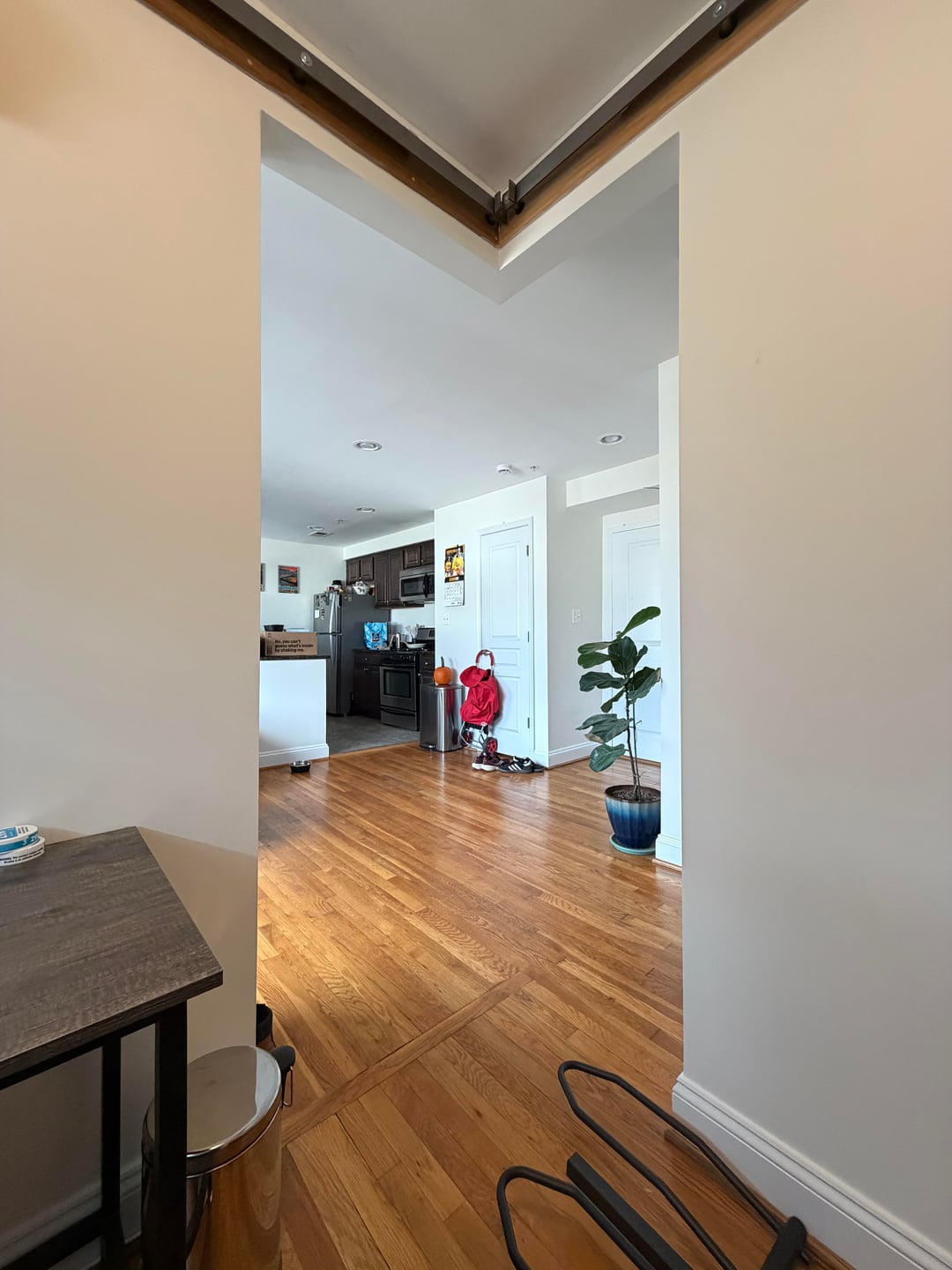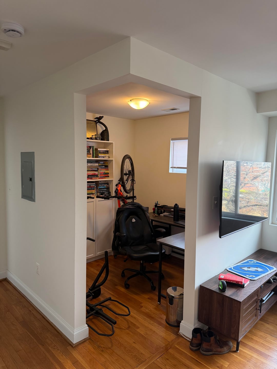 今年の初めにこのコンドミニアムを購入し、オフィスとして使用しているスペースがありますが、スペースを遮断するドアを設置する良い方法を探しています。前の所有者はスペースの内側にバーンドアレールを設置しましたが、私はバーンドアが欲しいとは思っていません。それが私の最善の選択肢でしょうか?それとも、角の出入り口を閉める素敵な方法について、何か良いアイデアはありますか?前もって感謝します!