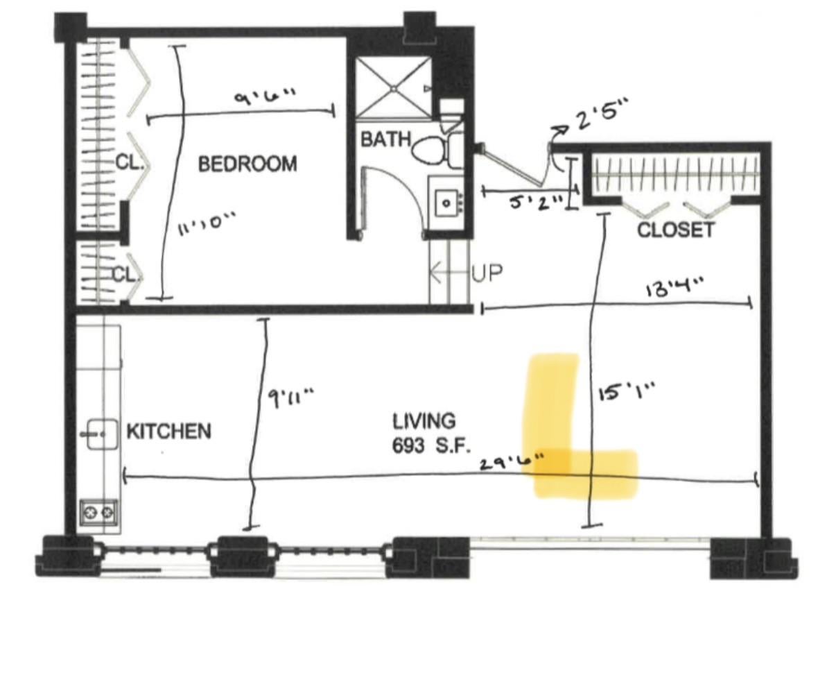 分割スタジオに引っ越したので、スタジオではありますが、私の部屋までは階段で上がりました。ハイライトされたスペースにL字型のソファを置きたいのですが、どのサイズのソファを買えばよいかわかりません。サイドテーブルを置くスペースと十分な歩行スペースが欲しい。壁に向かってテレビスタンドと小さなコーヒーテーブルを置きます。そして、ソファとキッチンの間のスペースをどうするかについて何か提案があれば、ぜひアドバイスをお願いします。