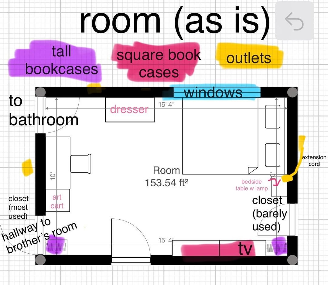 すべての基礎を得るために、私の部屋のレイアウトを添付しました。左上隅にバスルームがあり、そこからクローゼットのある奇妙な小さな廊下を通って兄の部屋につながっています。私がそこにいないとき、つまり私が学校にいる間ずっと、彼はそこの正門から出入りします。裏道を通るより早いからです。したがって、彼が通り抜けることができるスペースを確保することが重要です。