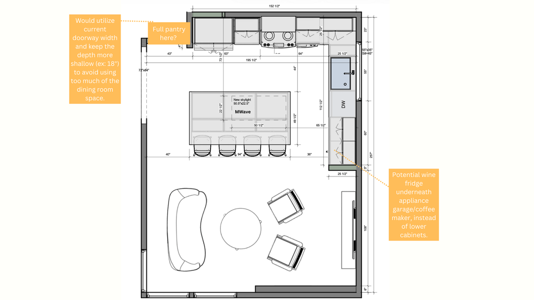 質問: 合理化されたキッチンのレイアウトよりも、対称性が失われ、ダイニングスペースが数インチ広くなることの方が重要でしょうか?通路やダイニングエリアに突き出た奥行きの浅いパントリーに対処したことがある場合、それはつまずきの危険やスペース計画の悪夢でしたか、それとも問題ではありませんでしたか?