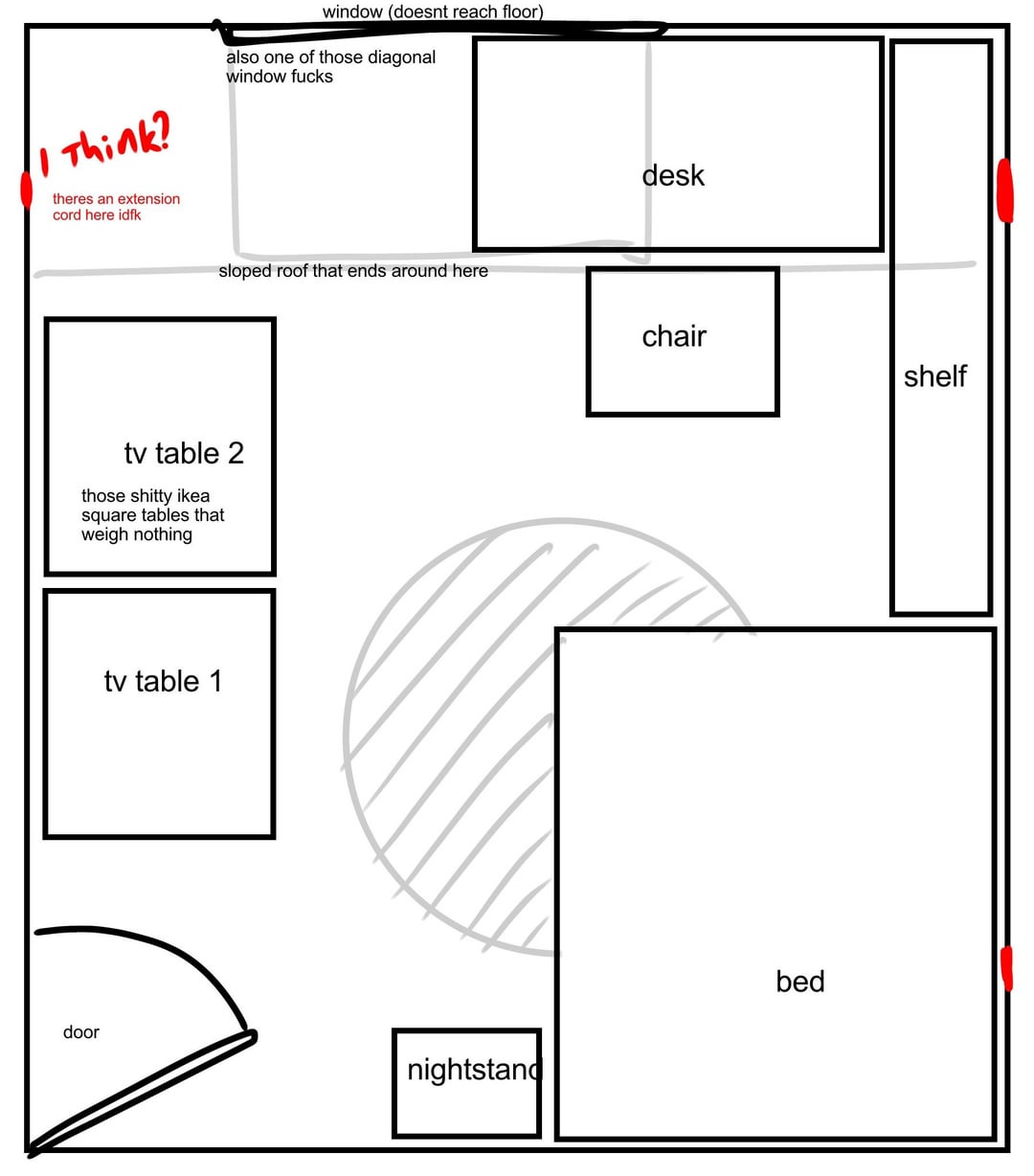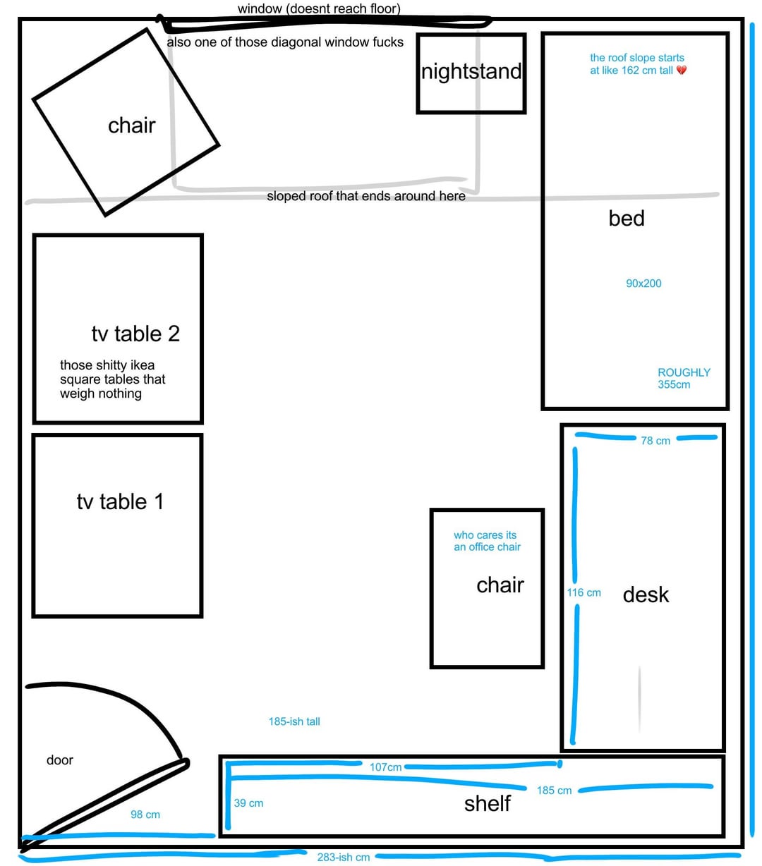現在、散らかっているだけで使用していないデスクがありますが、隅にあるため、その後ろで仕事をする意欲も感じられません。ベッドまではいつもまっすぐな道があるので、ベッドに横になって何もせずに少し憂鬱になろうとする動機がさらに高まります。また、私は頻繁に目が覚めてドアが怖いと感じていることにも気づいています。時々、部屋の隅に立っている大きな人が私を見ているように見えることがあります。窓のすぐ下にヒーターがあり、壁にボルトで固定されていますが、取り外すことはできないので、アクセスできるようにしたいと思います。