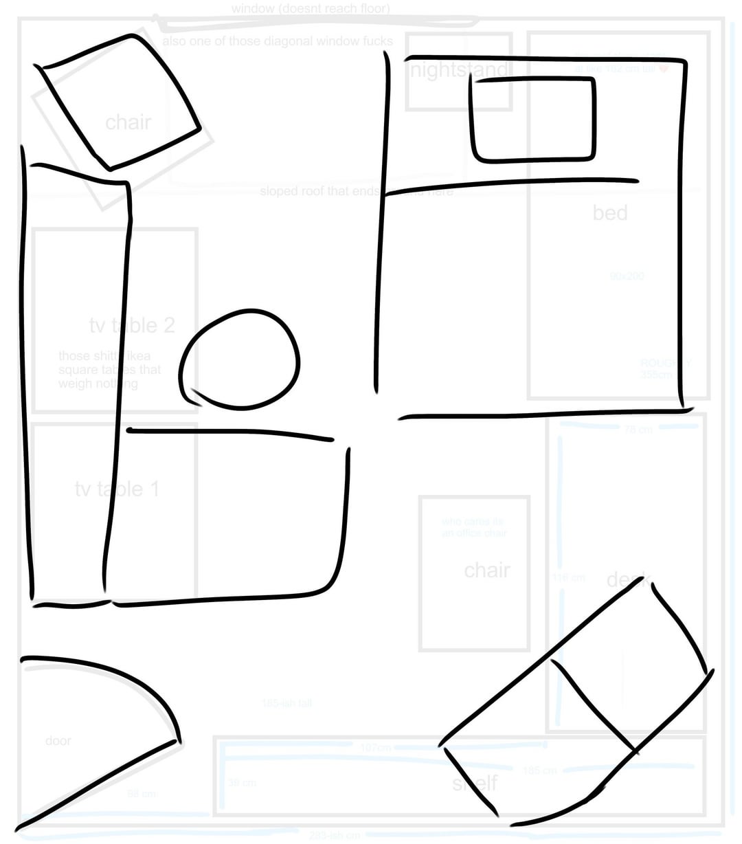 残念ながら、部屋が散らかっていたので写真はありません。代わりに、午前 2 時に撮った大まかな寸法を記したこの図面を用意します。私が買う予定の新しいベッドは 160×200 で、ヘッドボードがなく、両側に引き出しが付いていますが、片側にしかアクセスできないことはまったく気にしません。