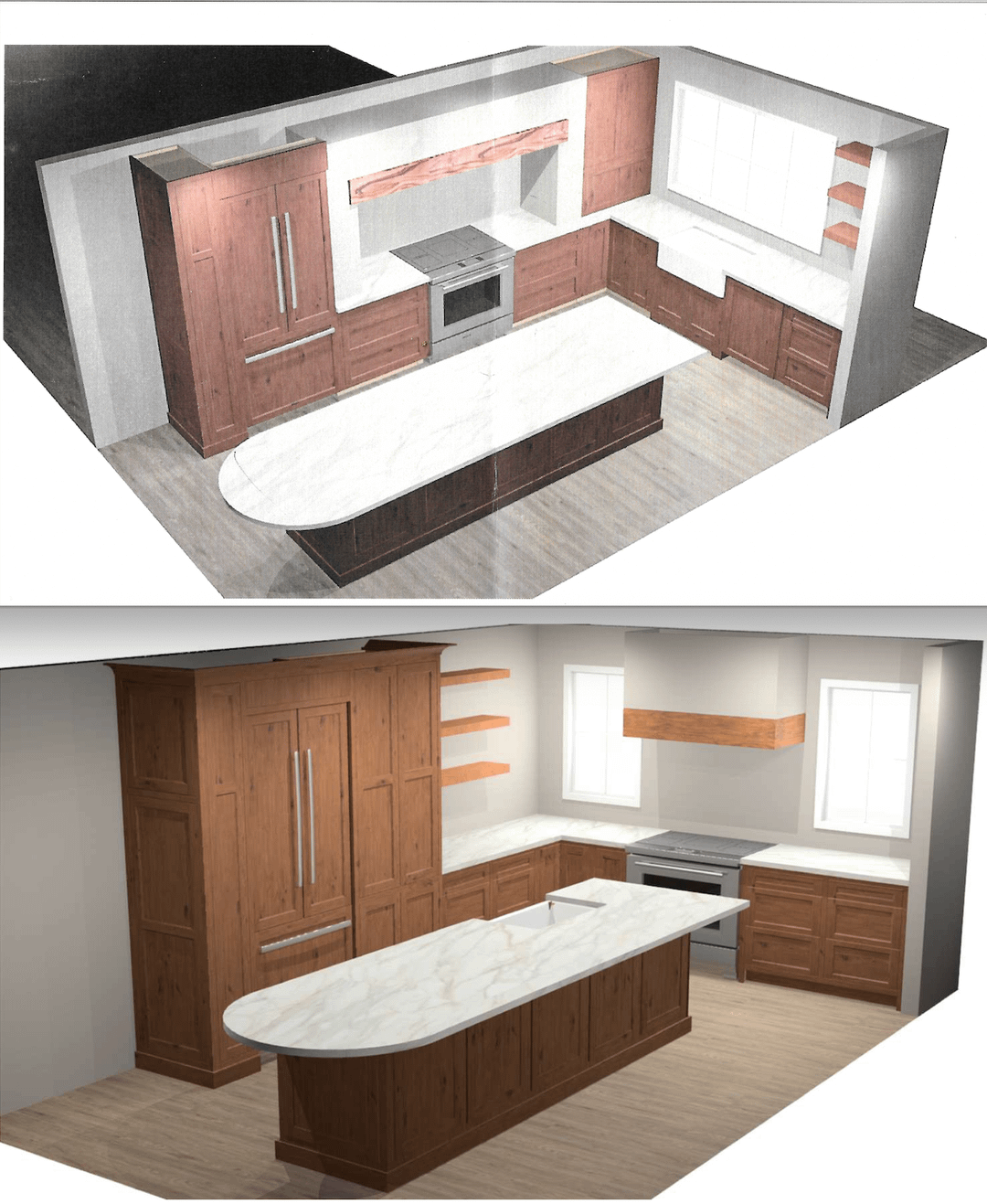バックストーリー – 増築 (ファミリー ルーム) を追加しながら、キッチンを家の中心から端の壁に移動しています。私は一緒に仕事をしているデザイナーにコンセプトとアイデアを提供しました。しかし、最初の 2 つの初期計画を見た後では、自分のアイデアが気に入るかどうか確信が持てなくなりました。