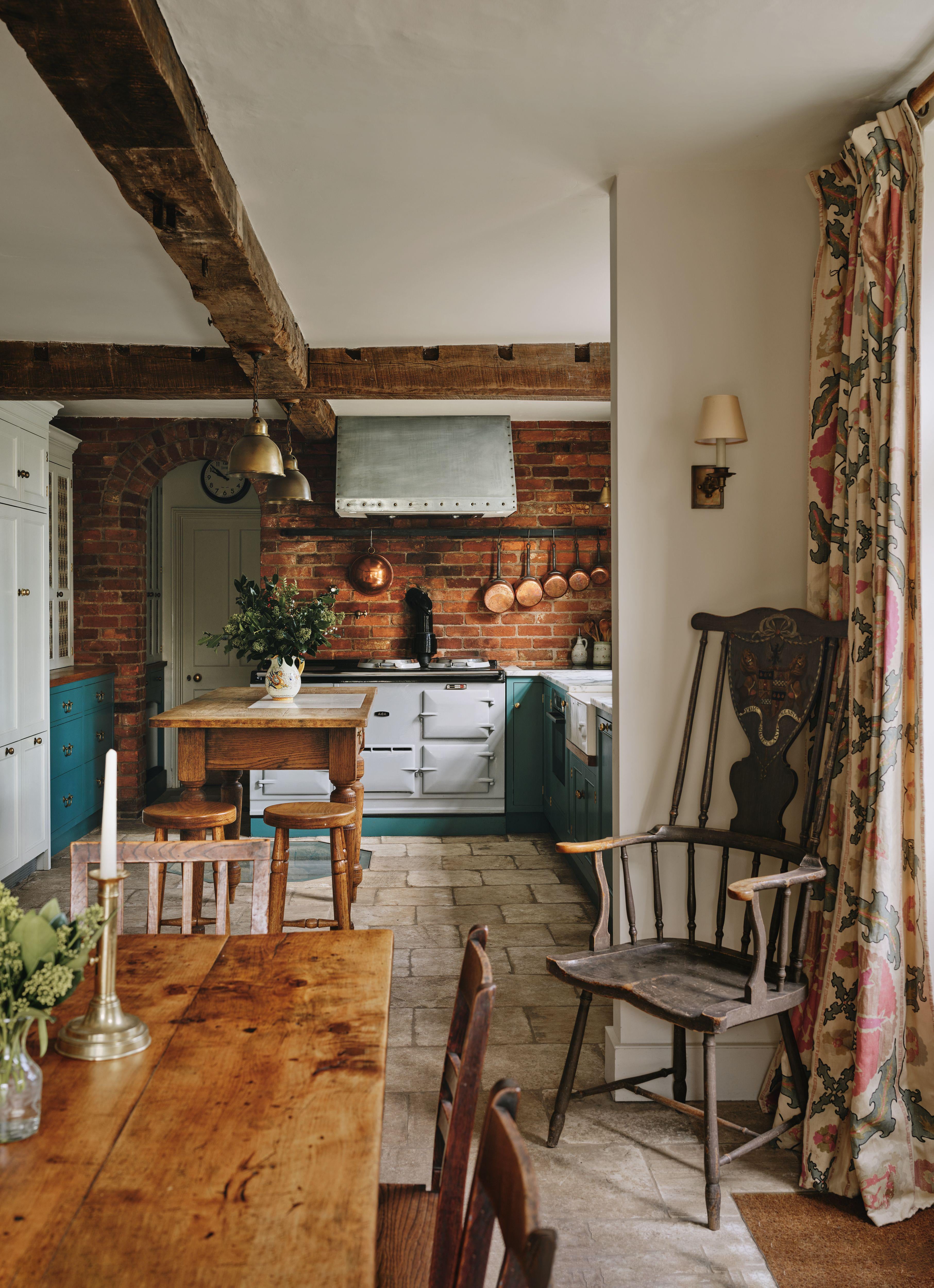 16 世紀の住宅を 18 世紀に増築した石灰岩の床のキッチン、イングランド南西部ウィルトシャー [3625×5000]