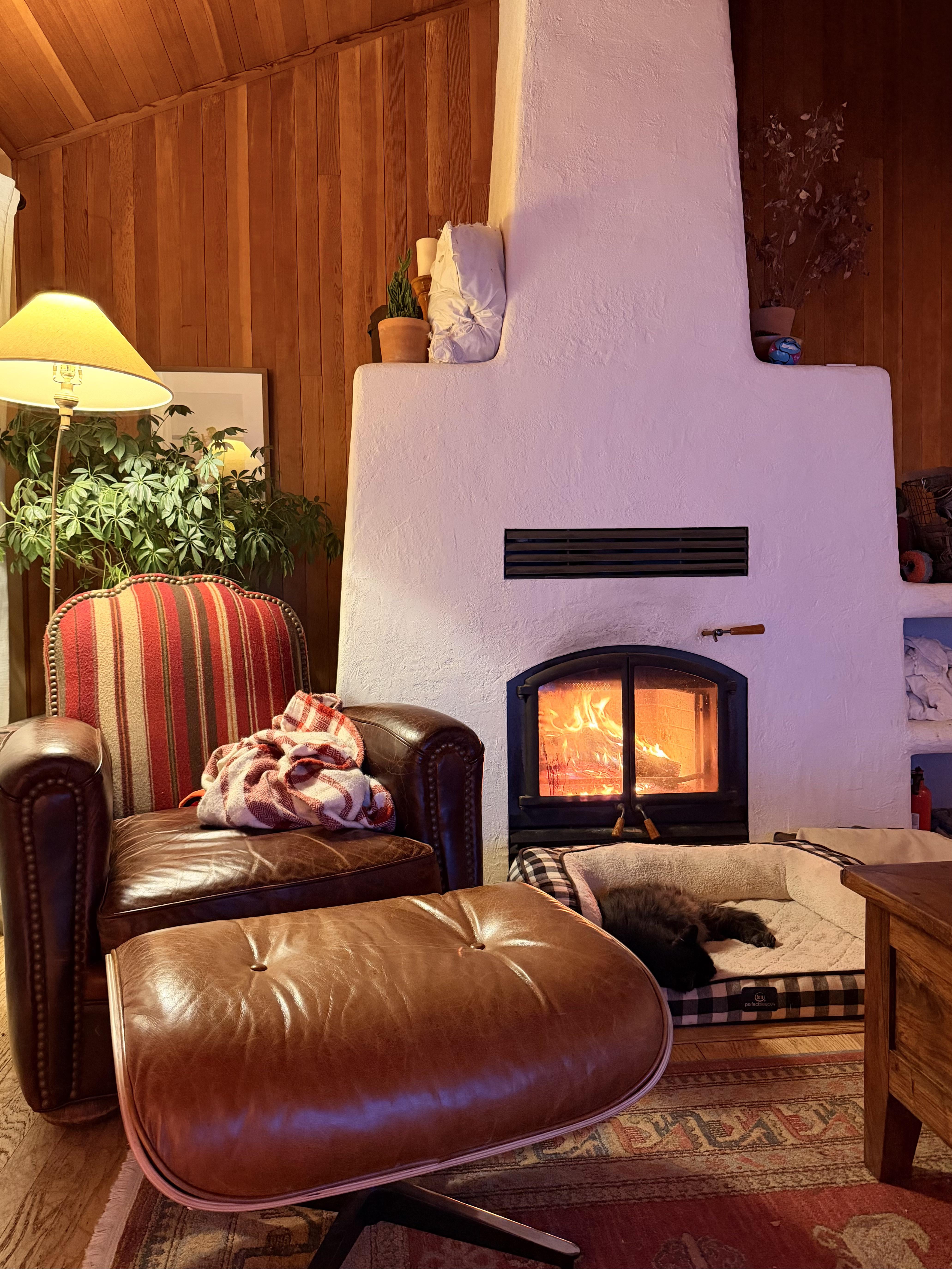 ソファから雪が降るのを眺める居心地の良いリビングルーム