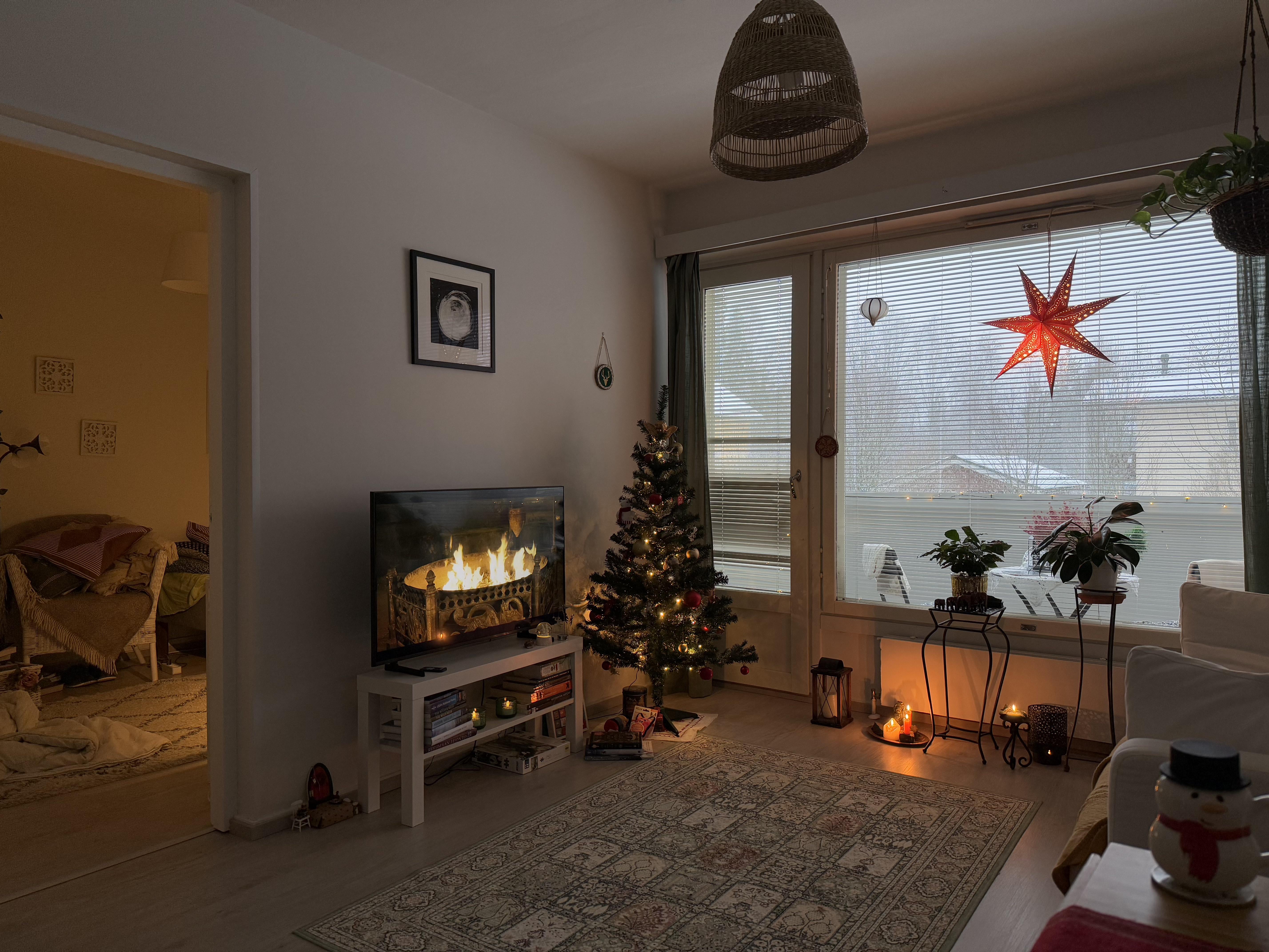 ソファから雪が降るのを眺める居心地の良いリビングルーム