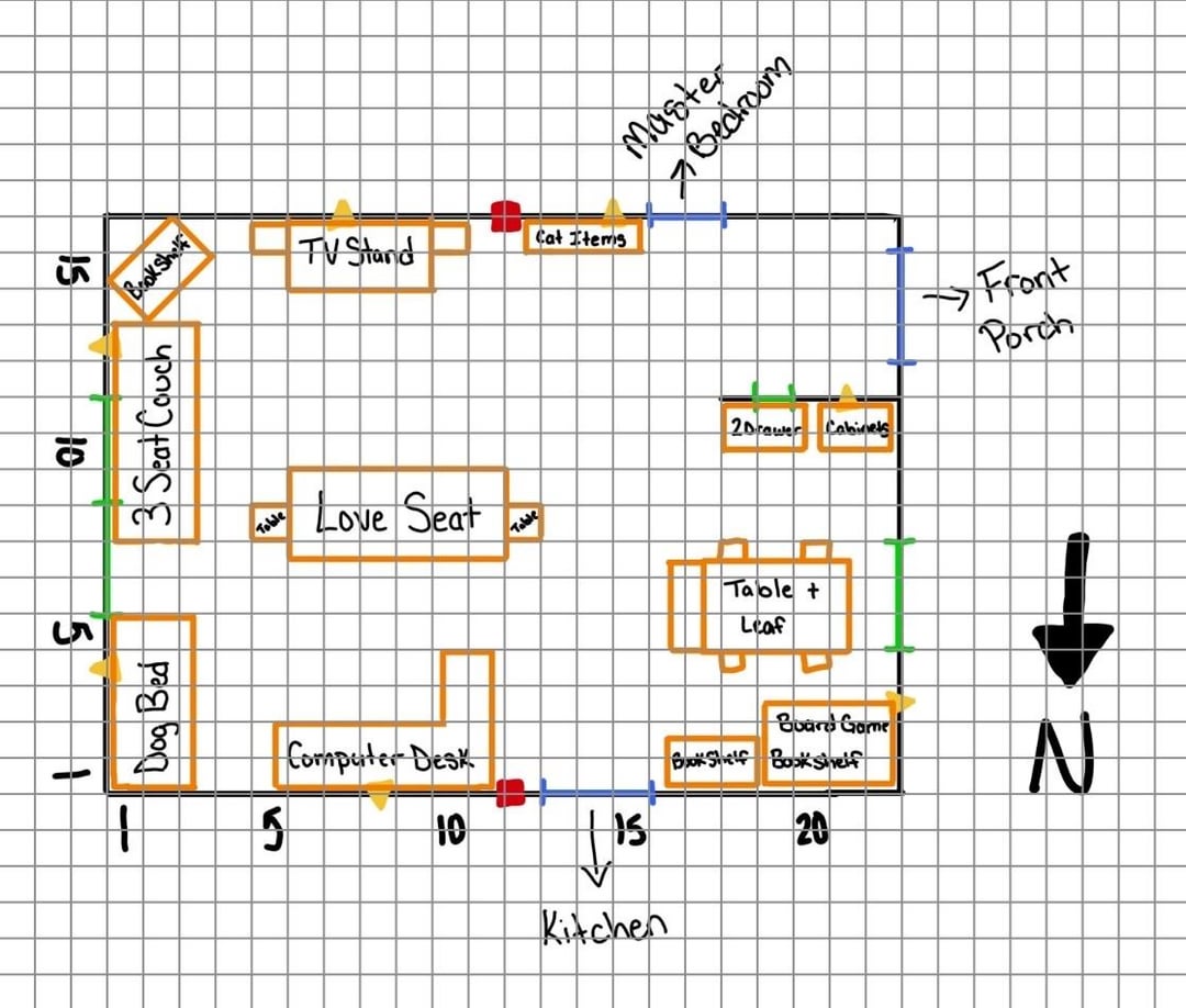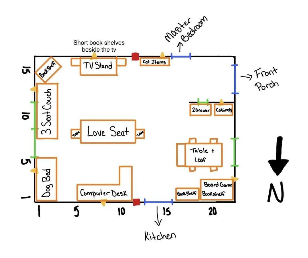 リビングのレイアウトに悩んでいます。考えられる限り最善の方法でレイアウトしましたが、何かが違うように感じます。部屋をセットアップするもっと良い方法はありますか?会社が終わっていない限り、ラブシートのみを使用しますが、これはめったにありません。テーブルゲームとボードゲームは混雑します。コンピューターデスクは少し脆く、正直に移動しても耐えられない可能性があるため、移動しないことをお勧めします。テーブルとボードゲームのキャビネットはすぐに書斎に移動されるかもしれませんが、まだ決まっていません。これらの測定値はおおよその値です。何か提案があれば助かります!画像キー: 🔵 ドア 🟢 窓 🟡 コンセント 🟧 家具