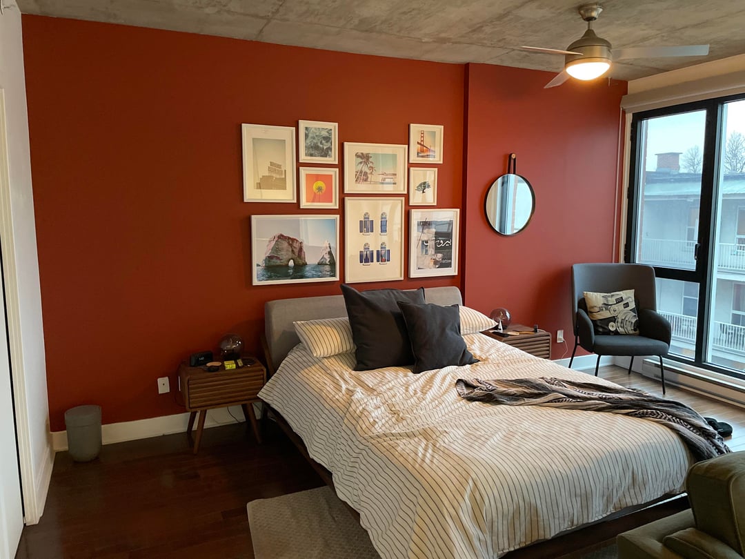 キングサイズへのアップグレードを検討しています(写真はクイーンサイズのベッドです)。設置する場合、同じ場所(ベッドの右側、壁の突起に対して約 3 インチ/7 cm)に置くべきでしょうか、それとも壁全体の中央に置き、壁の突起の前に置くようにすべきでしょうか。