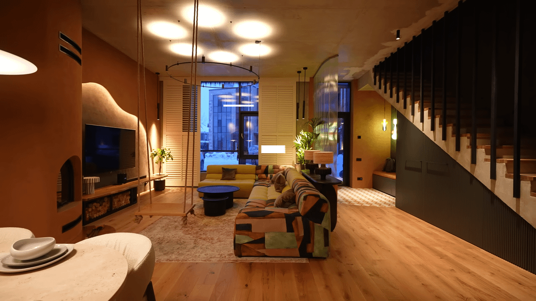 ソファから雪が降るのを眺める居心地の良いリビングルーム