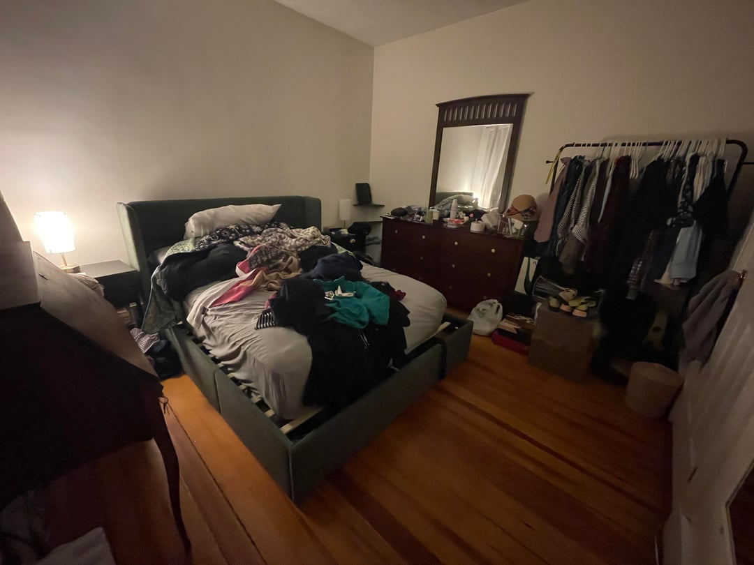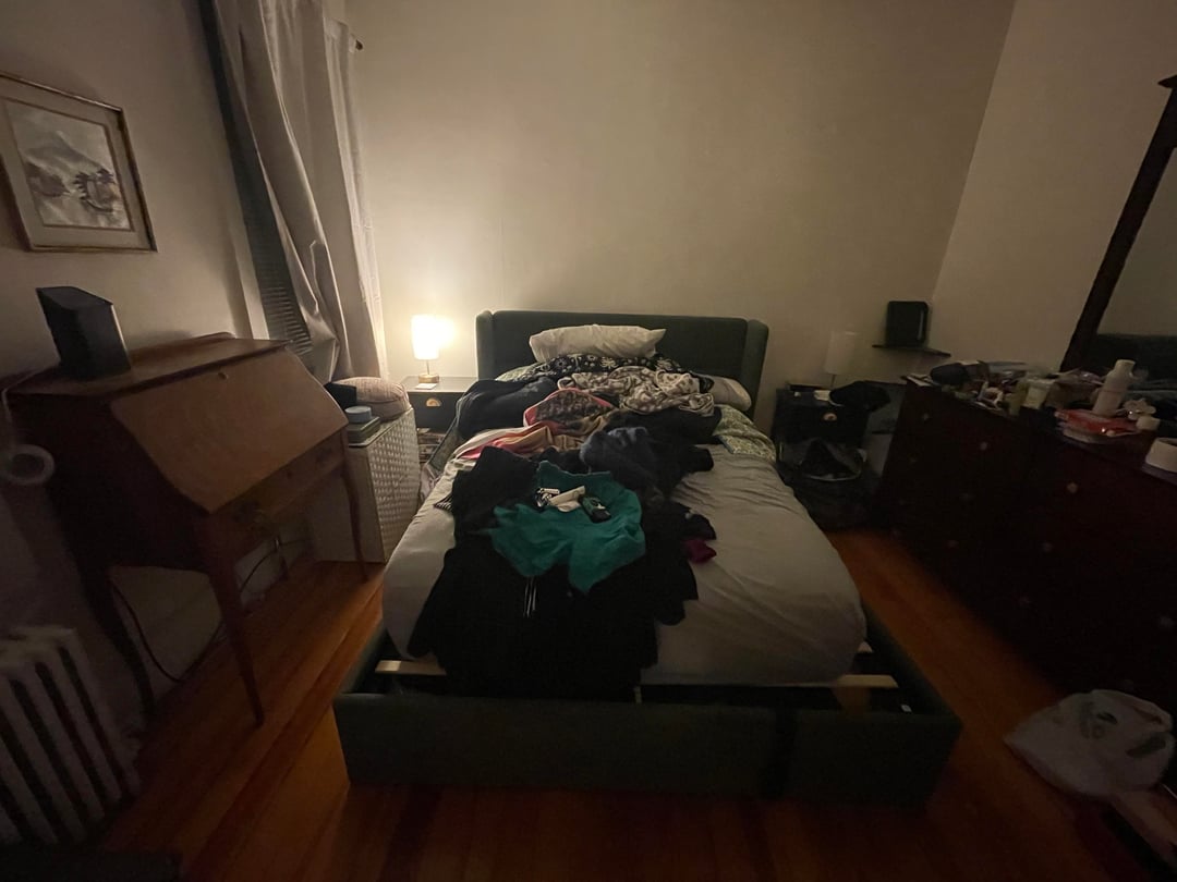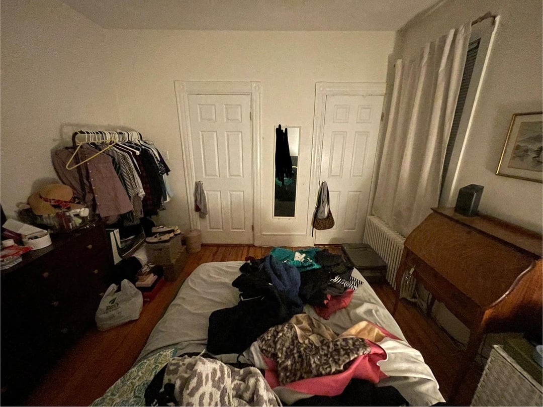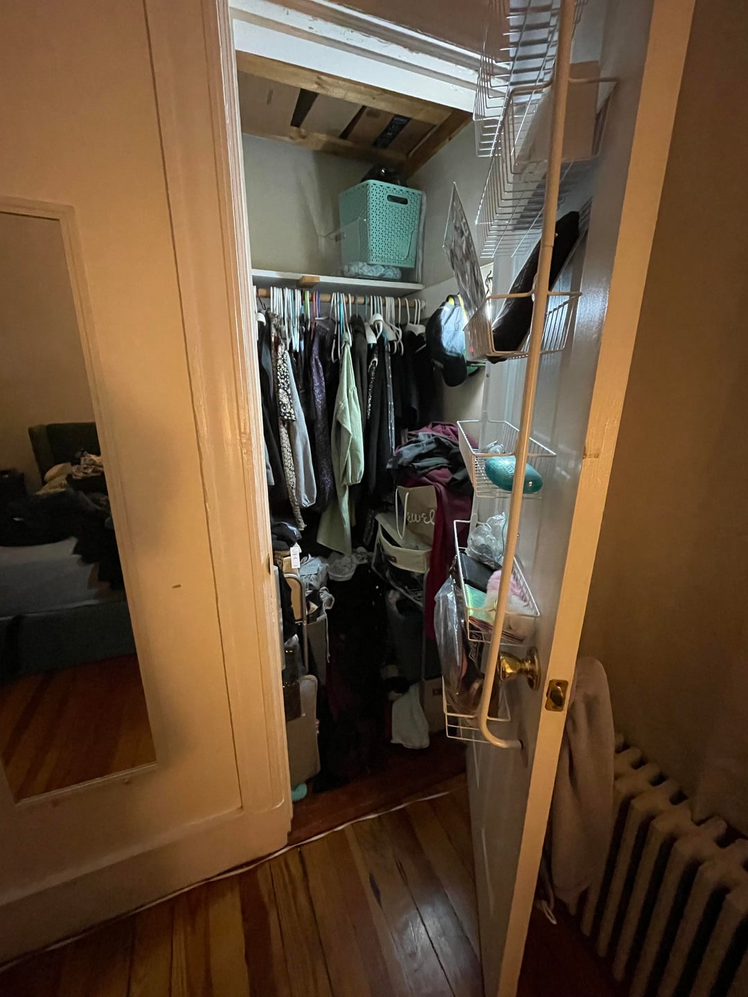 それに加えて衣類の収納にも困っています。クローゼットはわずか28です" ×28"、照明はなく、ドアは完全に開きません(ラジエーターがドアを開くのを妨げます)。すでに所有していた衣類ラックと大きなドレッサーを持ち込み、右側の壁を占領しています。