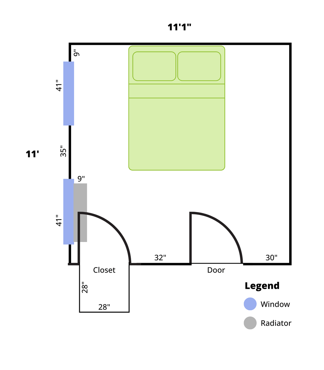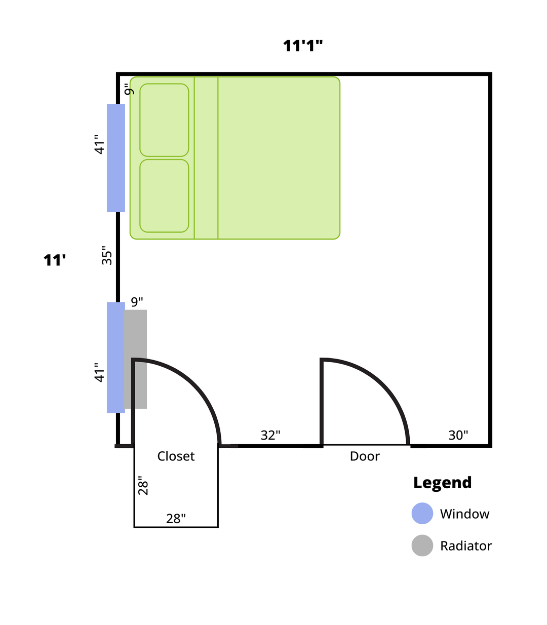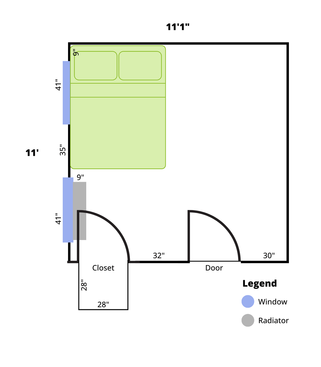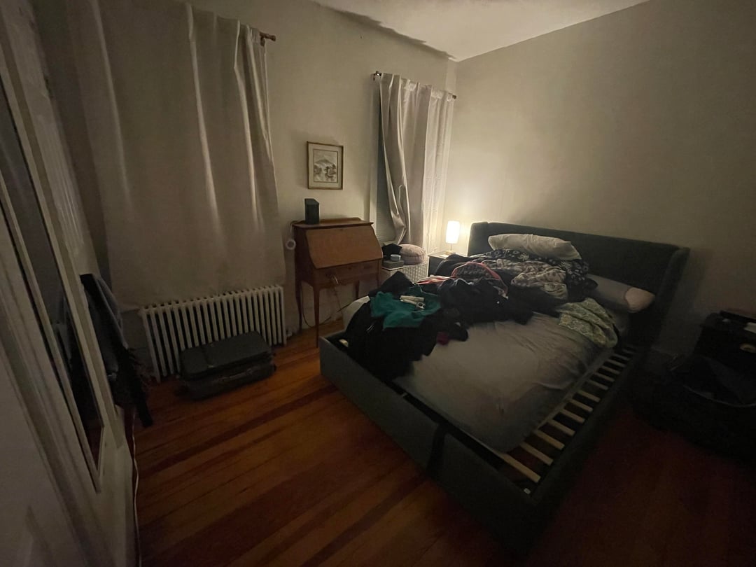 それに加えて衣類の収納にも困っています。クローゼットはわずか28です" ×28"、照明はなく、ドアは完全に開きません(ラジエーターがドアを開くのを妨げます)。すでに所有していた衣類ラックと大きなドレッサーを持ち込み、右側の壁を占領しています。