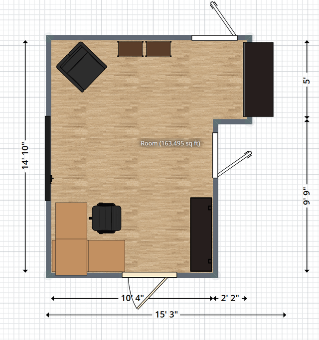 ちなみに、上のドアは入り口、右側のドアはバスルームのドア、下のドアはパティオ/屋外エリアへの引き戸です。入り口右側のブロックはミラー扉が付いたクローゼットです。