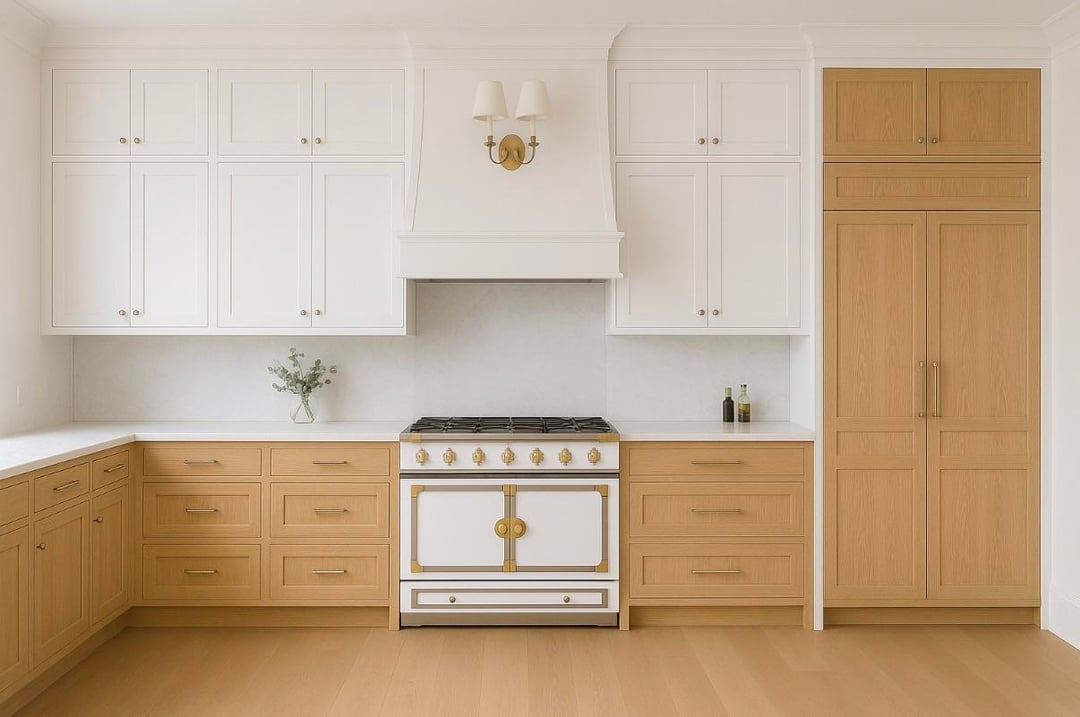 アイランドにはステンレス製のスピードオーブンと、パネル対応の Bosch 800 食器洗い機も設置します。キャビネットは下段がホワイトオーク、上段がホワイト塗装となります。タージマハルのカウンタートップ、島はクリスタッロ珪岩で、グレーとピンクが入ります。