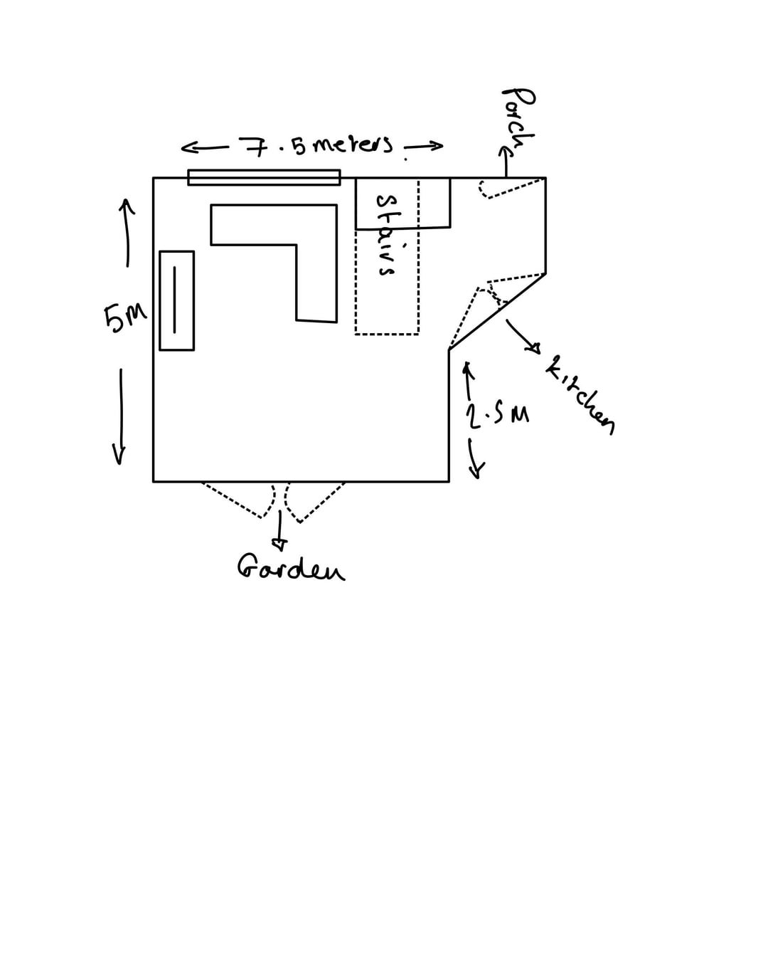 これまでのところ、私たちのアイデアは、庭へのフレンチドアの近くにある種の本棚/アクセントチェア、そしてその向かいにある種の大きな収納ユニットで止まっています。