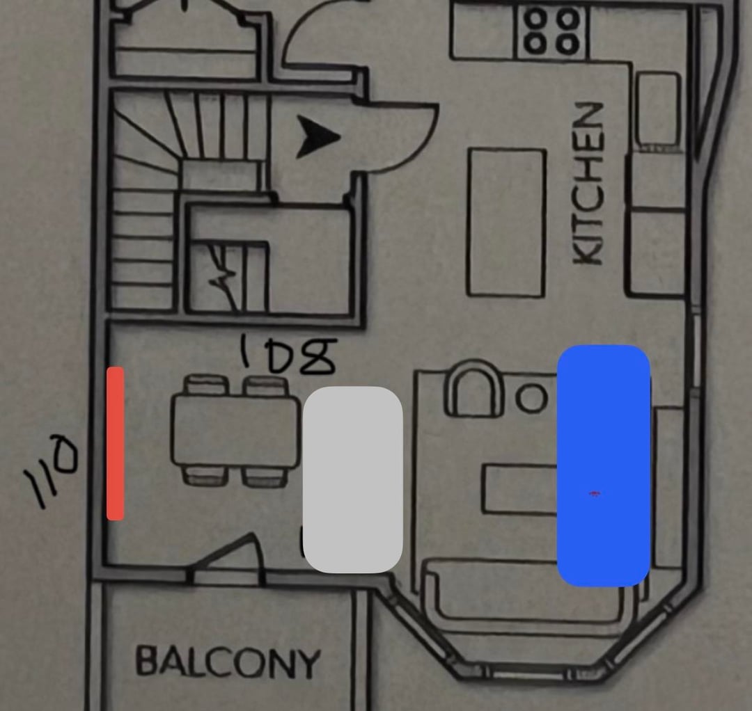 小さなスペースがあり、そこにミニダイニングルームとリビングルームを設置しようとしています。小さな正方形のセクションの寸法はインチで表示されているため、約9フィート×9フィートです。