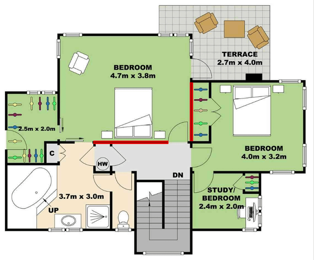 - 子供用寝室 2 室 (キングシングルベッド、デスク、ワードローブを置くのに十分な大きさが理想的)