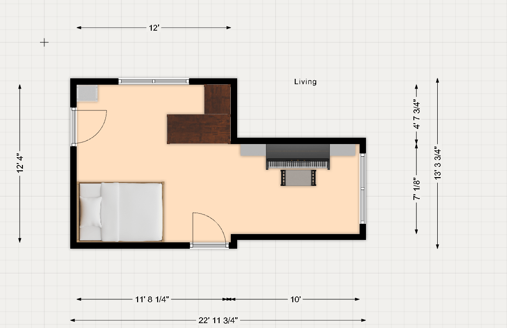 最初に考えたのはこのレイアウトでしたが、ベッドや机の位置があまり気に入りませんでした。右側の窓に向かってベッドを置くことも考えましたが、窓に向かってベッドを置くのは通常良くないことはわかっていますし、どちらの側にも 1 フィートほどしか隙間がありません。