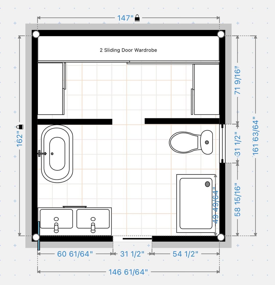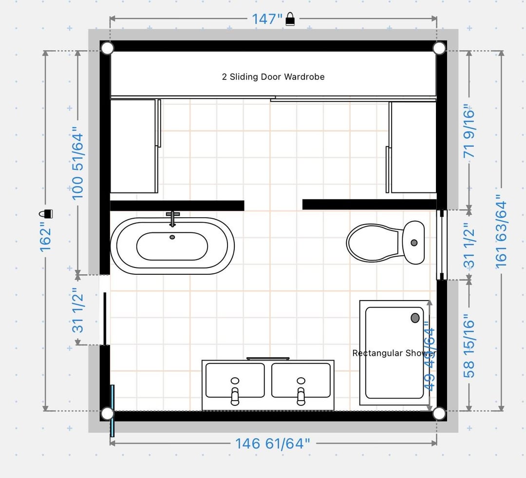 こんにちは。この部屋をどのように整理するか、ドア、トイレ、シャワー、バスタブ、化粧台をどこに置くかについての提案を探しています。ドアは左の壁または下の壁のどこにでも配置できます。