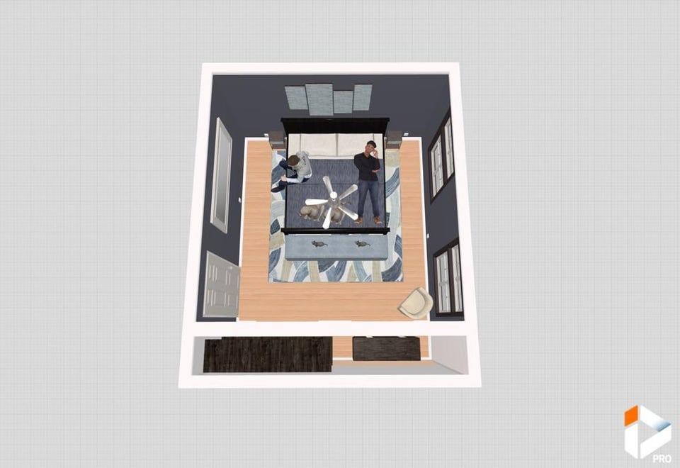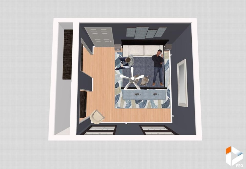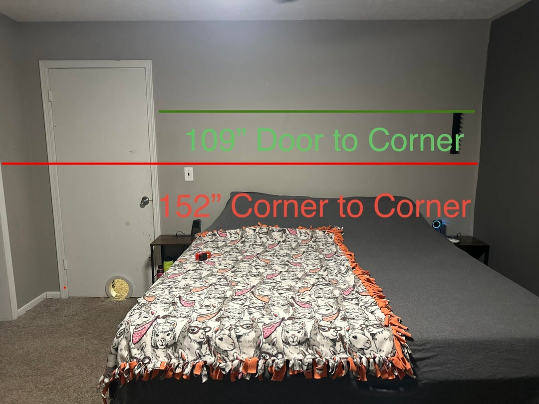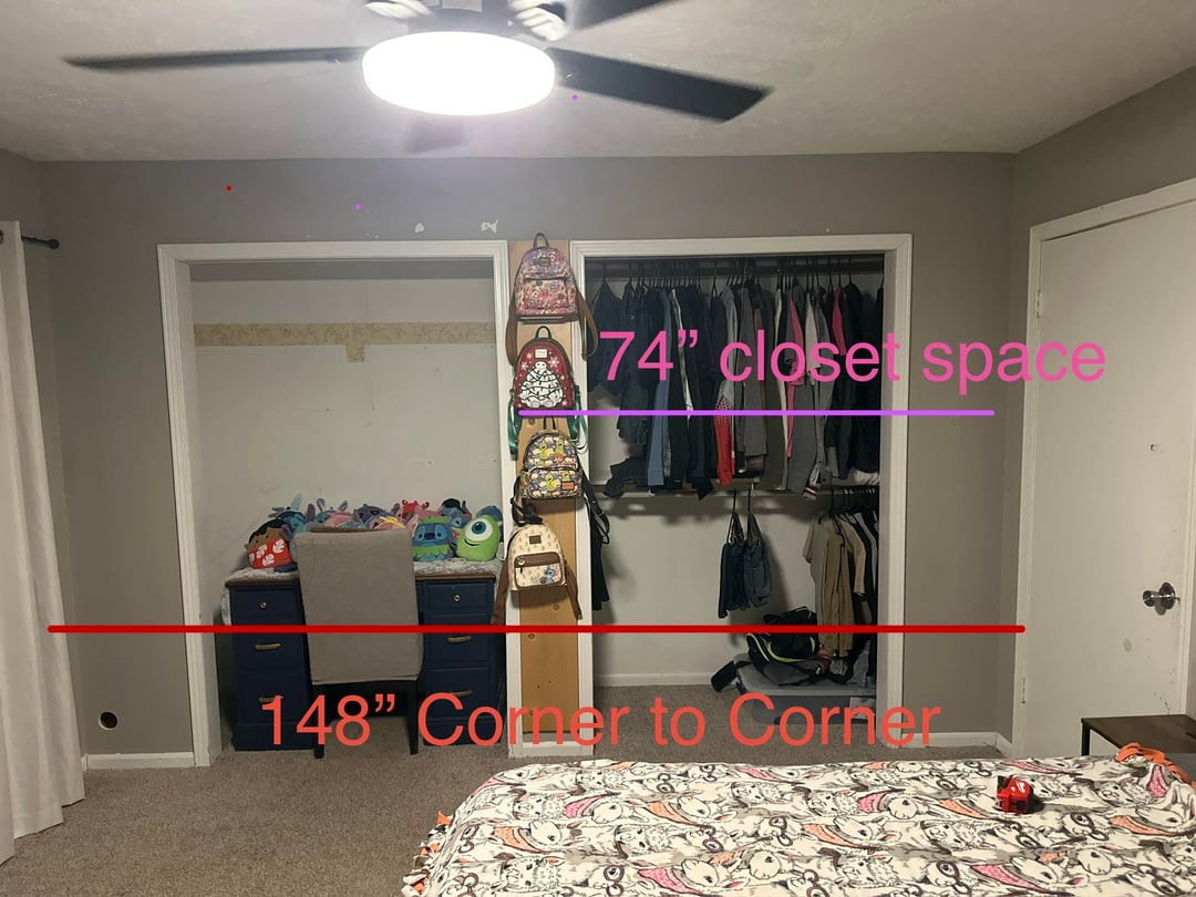 1&2.写真の寸法を使用した現在のセットアップ デスクはドレッサーに置き換えられます 3.現在のレイアウトでの寝室の模様替えのスケールデジタルモック 4.窓をブロックできないため、写真がベッドに合う唯一の方法です。 5&6。ペイントカラー